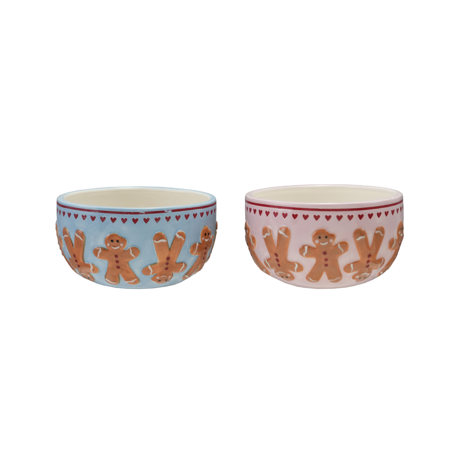 Hand-Painted Stoneware Bowl with Wax Relief Gingerbread Pattern & Hearts, 2 Colors