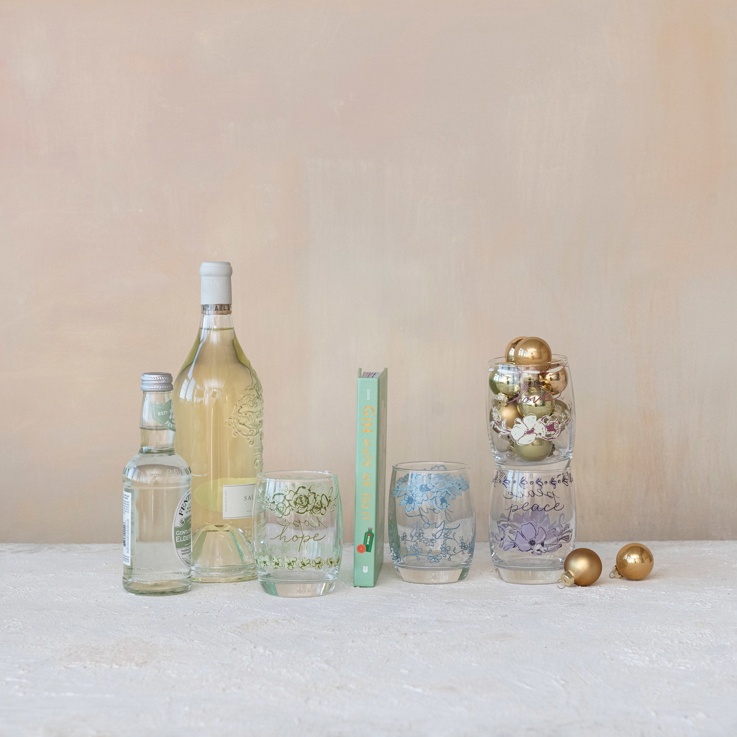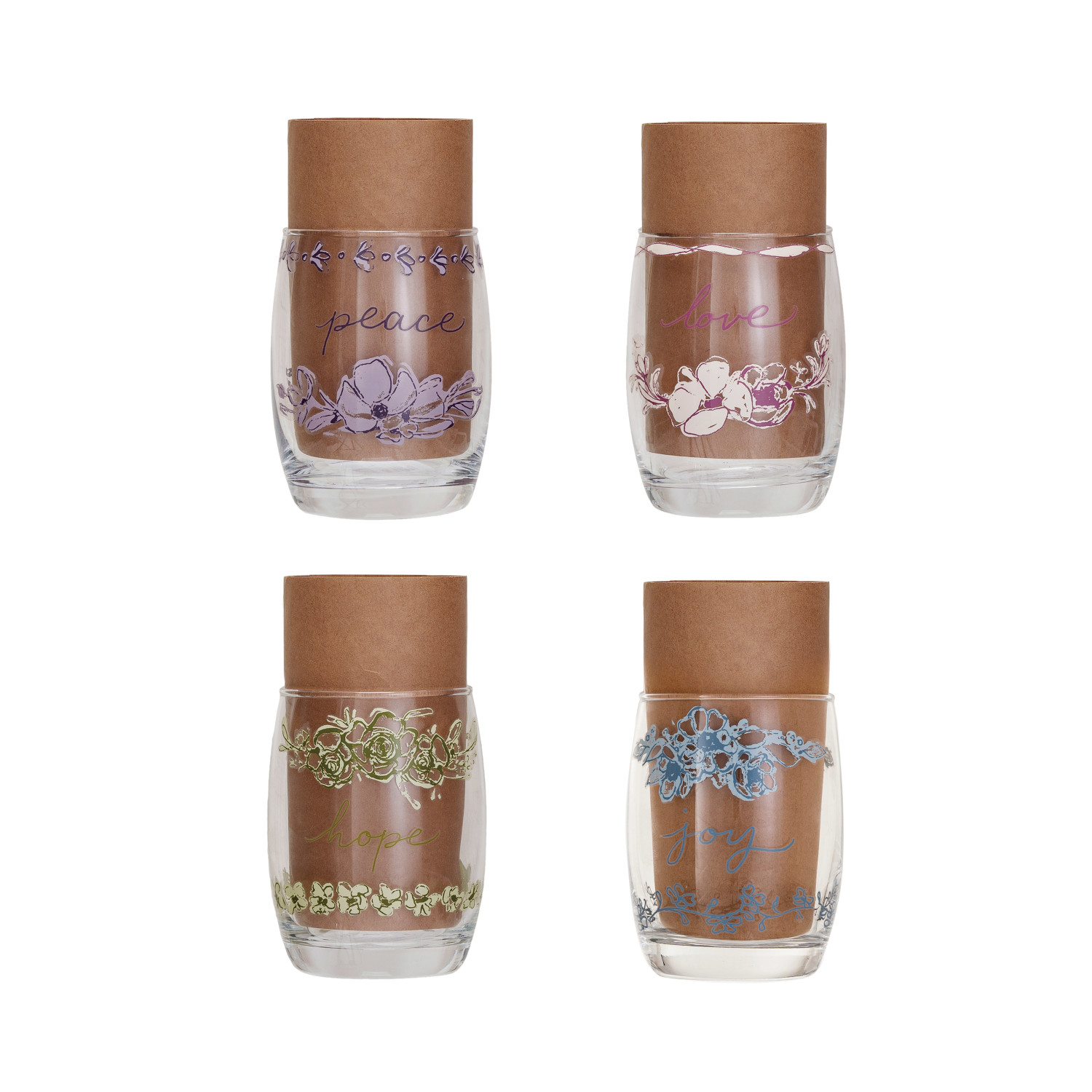 This set of 4 glass drinking glasses with flowers and words is a delightful and colorful way to enjoy drinks and enhance the dining experience. The glasses come in 4 styles, each featuring a different flower and word. The words are "love", "joy", "hope", and "peace". The glasses are made of glass and have a clear, smooth surface. They can be used for serving beverages, or as a decorative piece. The glasses measure 2.75 inches in diameter and 4 inches in height, with a capacity of 12 ounces. They are perfect for everyday dining and entertaining, or as a thoughtful gift for loved ones. A lovely and colorful set of 4 glass drinking glasses that feature flowers and a word in multicolor and round shape. A perfect choice for seasonal dining, or a thoughtful gift for loved ones. This set of glasses can be used for serving beverages, such as coffee, tea, cocoa, or cider, or as a decorative piece on the table or shelf.