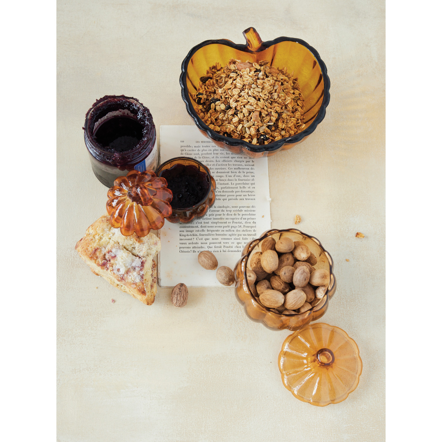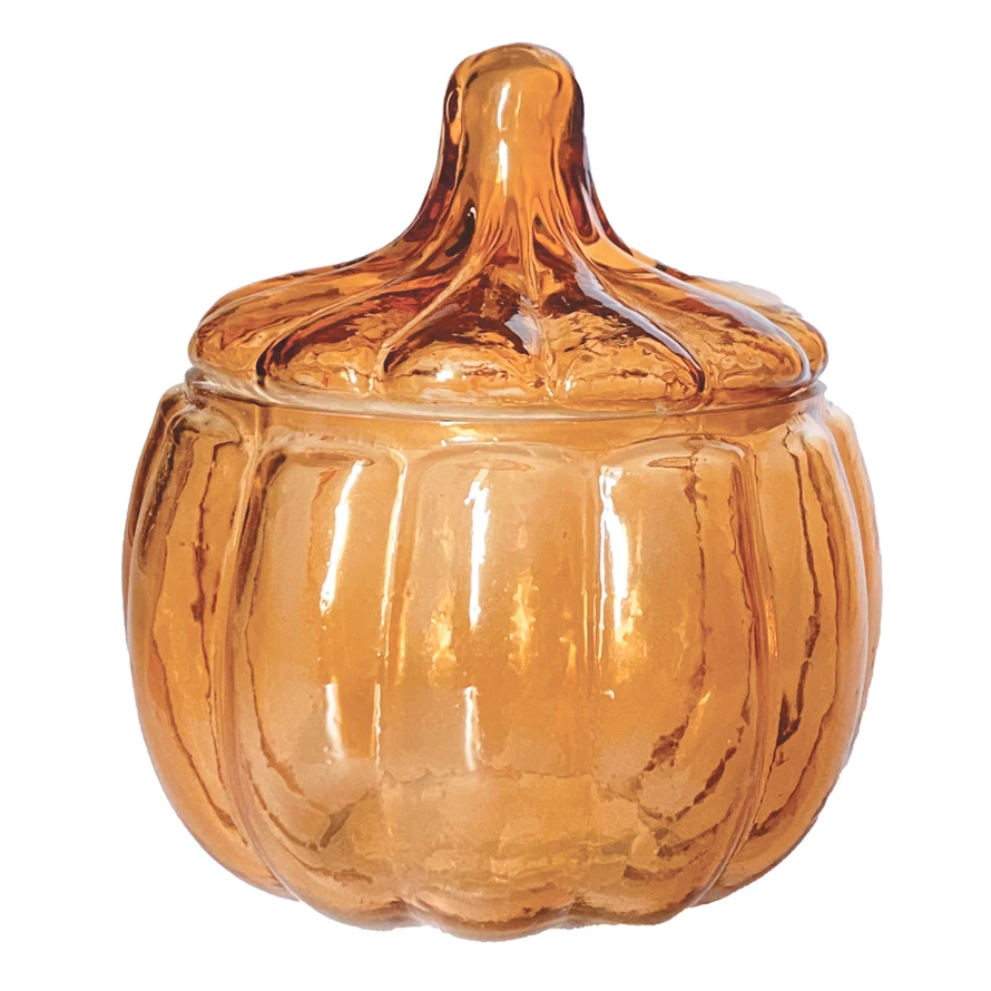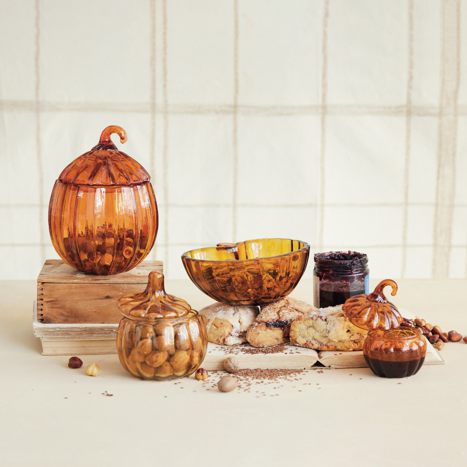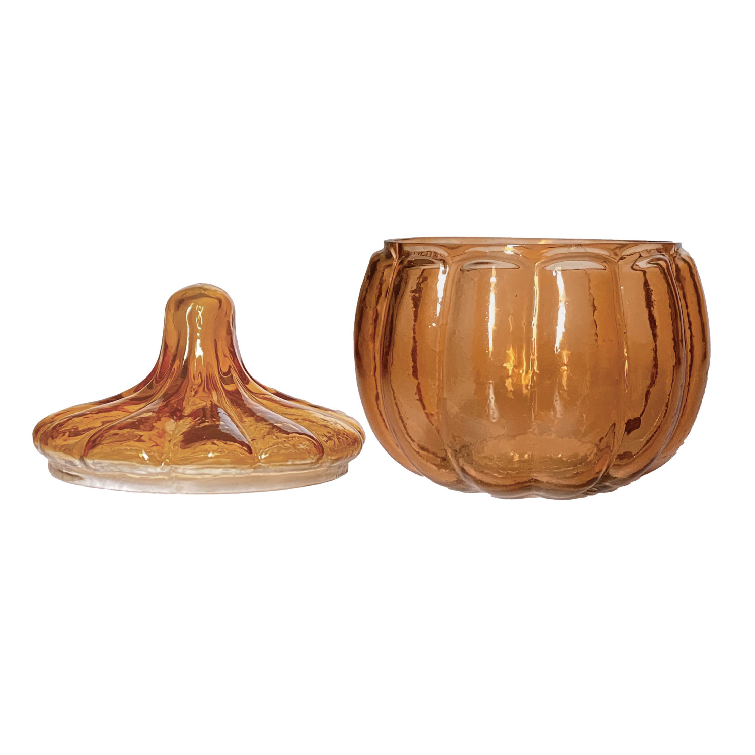 Hand-Blown Glass Pumpkin Shaped Jar with Lid, Amber Color