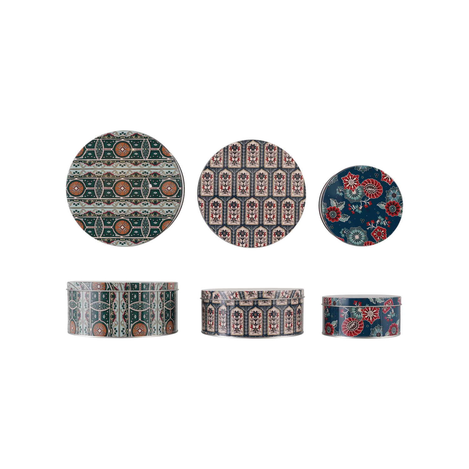 Catalog Name: 8" Round x 3-1/2"H, 7-1/4" Round x 3"H & 5-1/2" Round x 2-1/2"H Tins w/ Lids & Patterns, Multi Color, Set of 3 ©
