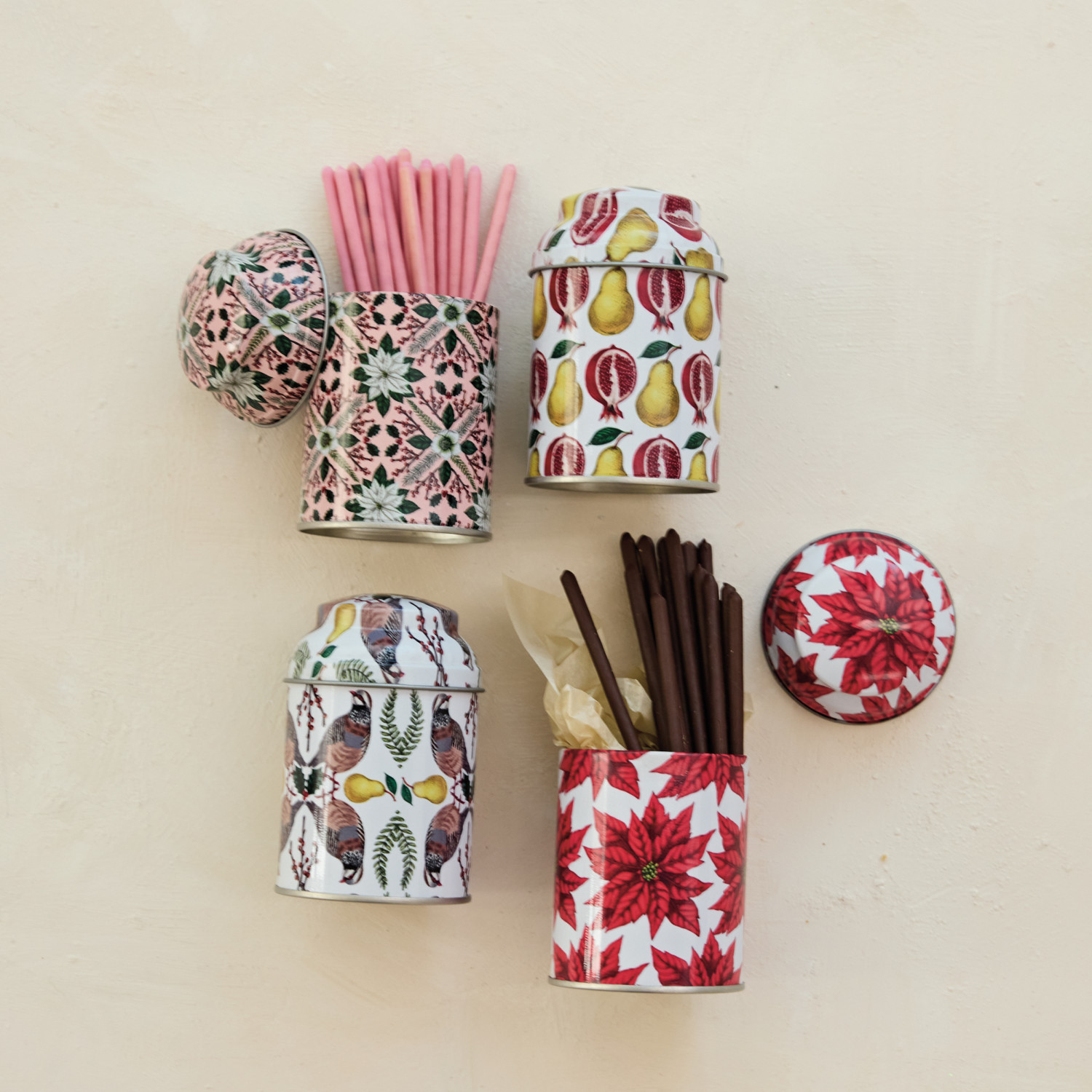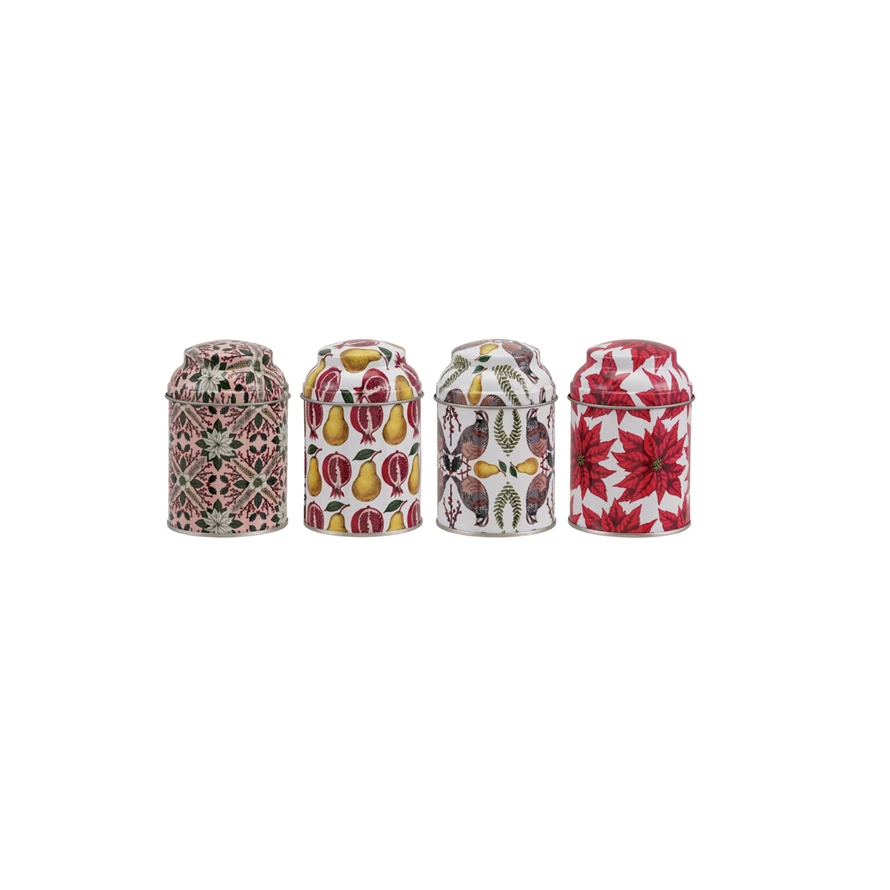 Tin Container with Lid & Seasonal Botanical/Animal Pattern, 4 Styles ©