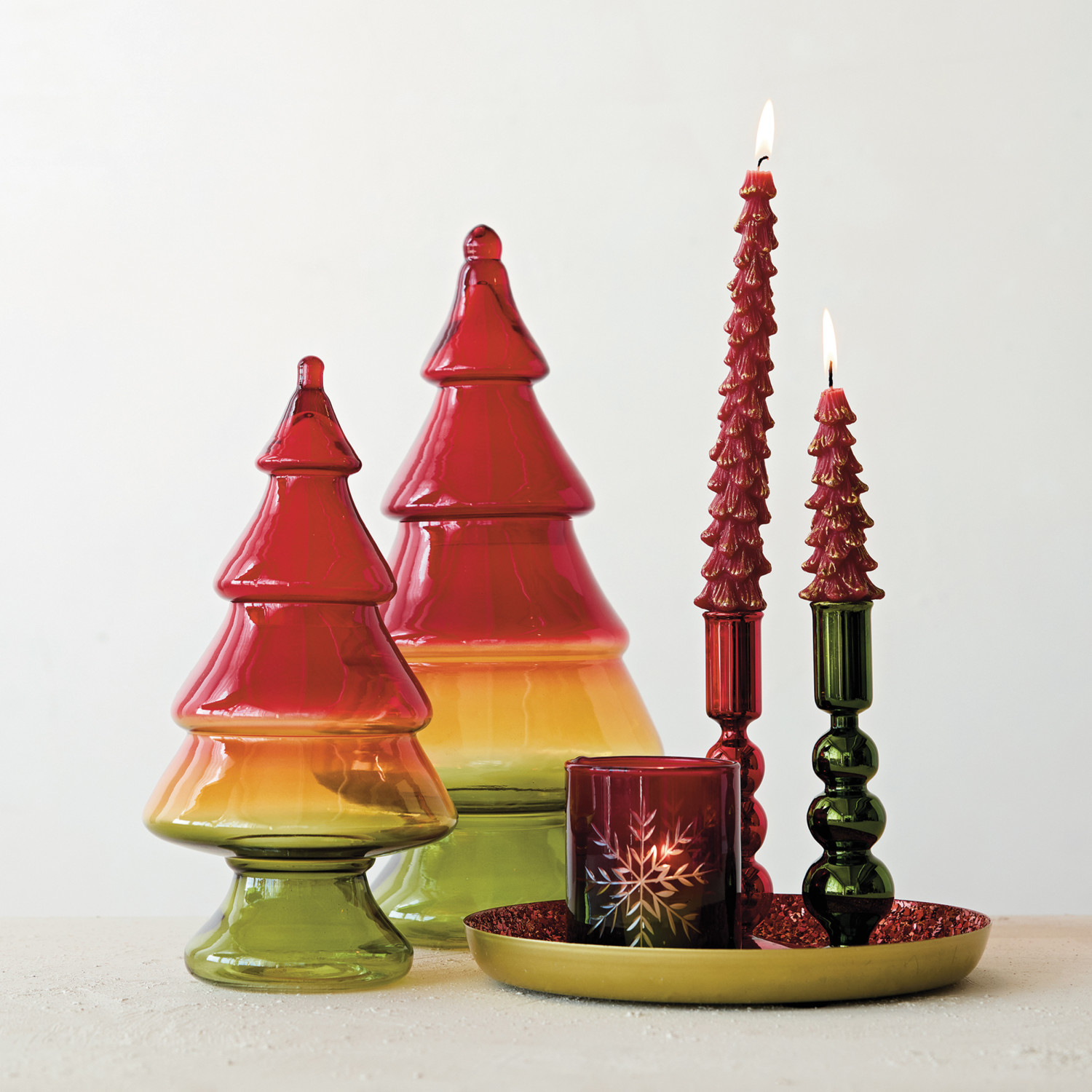 Catalog Name: 7-3/4" Round x 15"H Hand-Blown Glass Tree Shaped Jar w/ Lid, Red, Yellow & Green