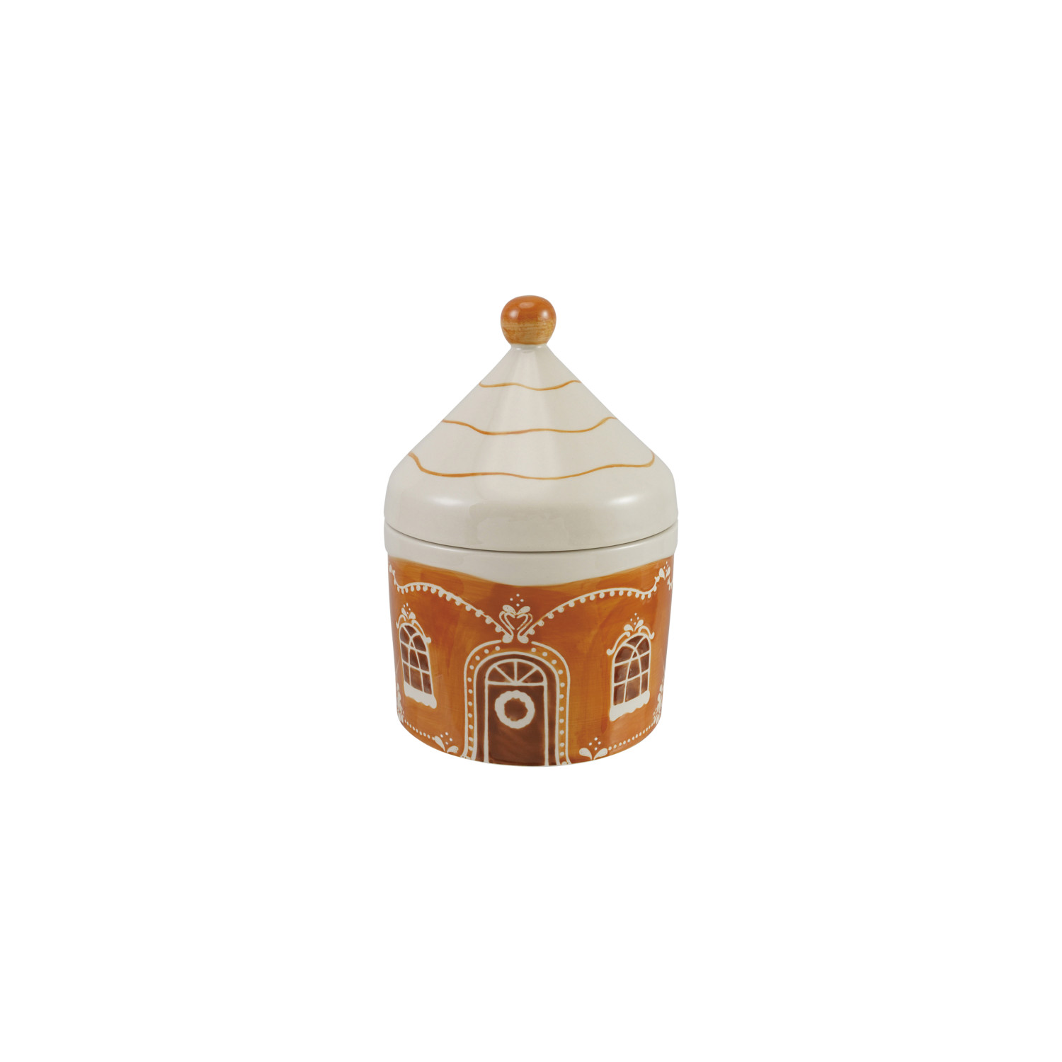 Catalog Name: 6-1/4" Round x 9"H Hand-Painted Stoneware Cookie Jar w/ Lid & Wax Relief Gingerbread Design, Brown & White