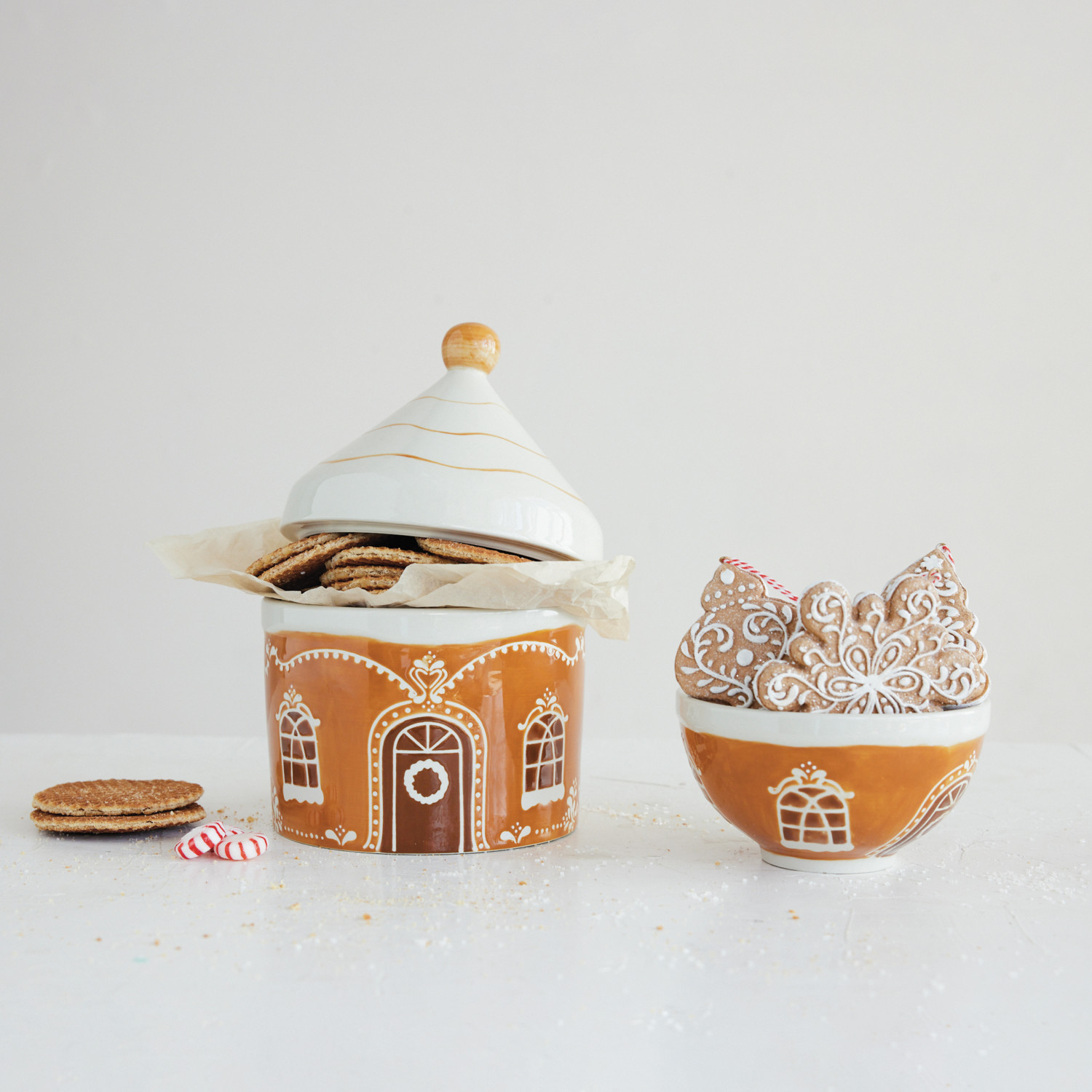 Hand-Painted Stoneware Cookie Jar with Lid & Wax Relief Gingerbread Design, Brown & White