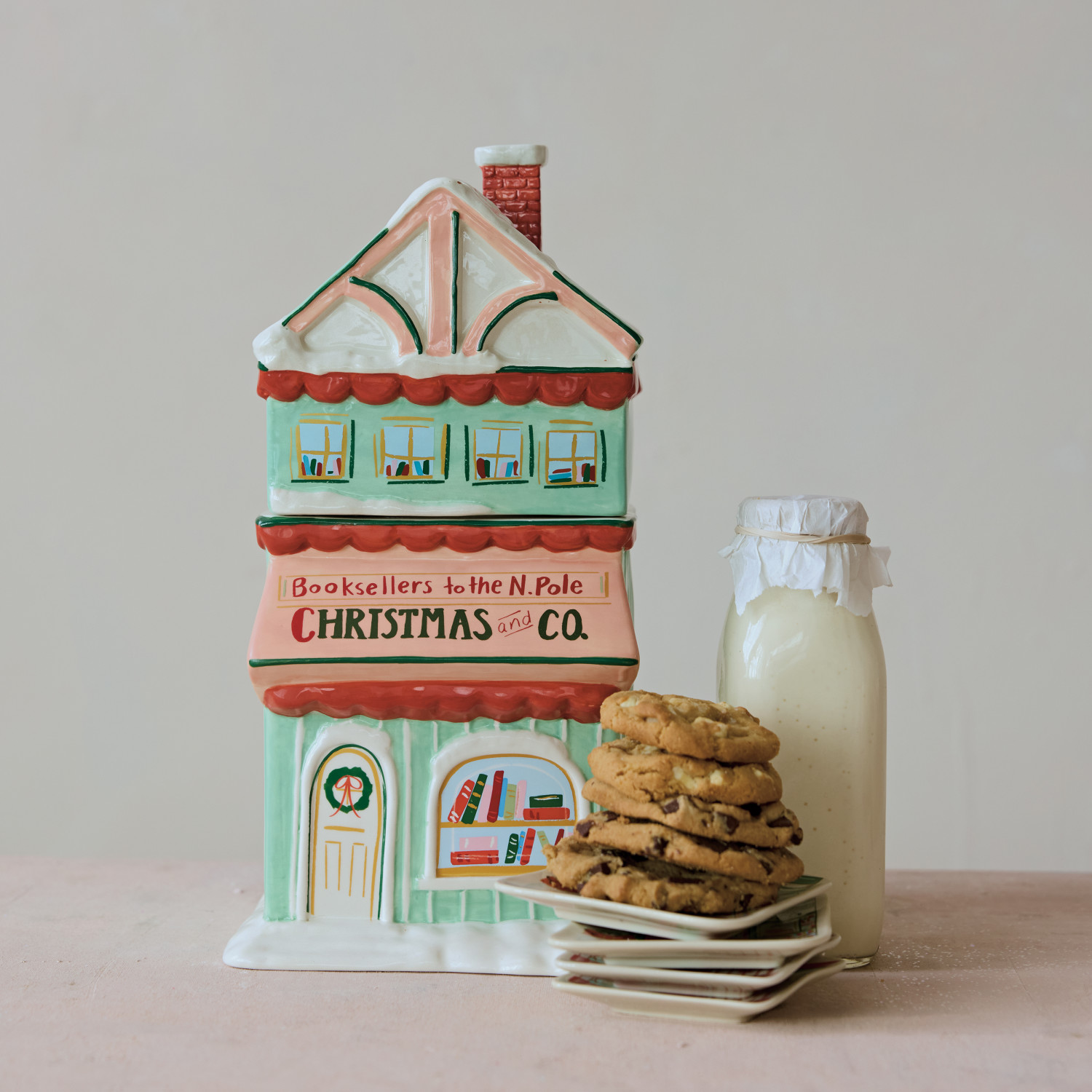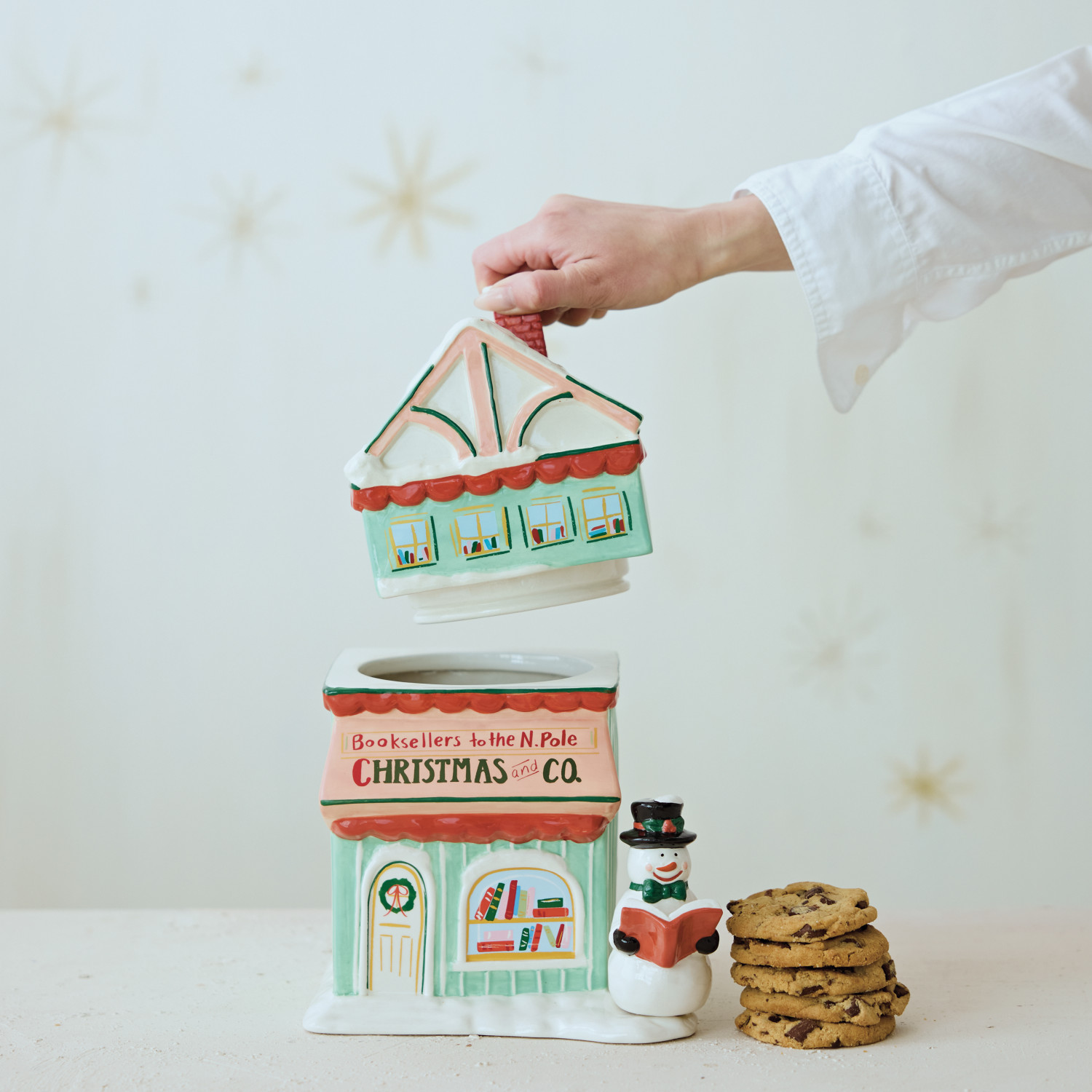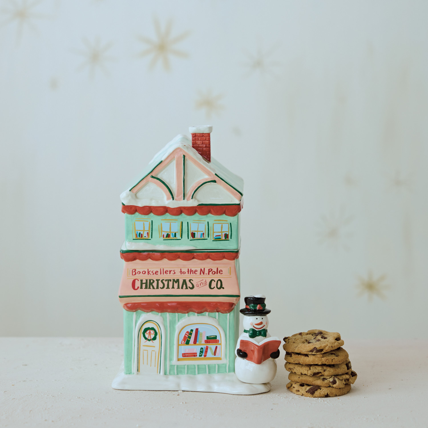 Hand-Painted Ceramic Bookstore Shaped Cookie Jar with Snowman "Christmas and Co." ©