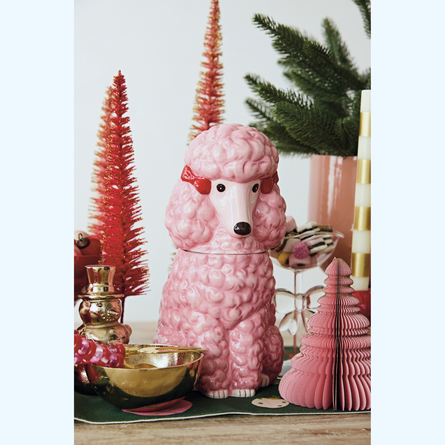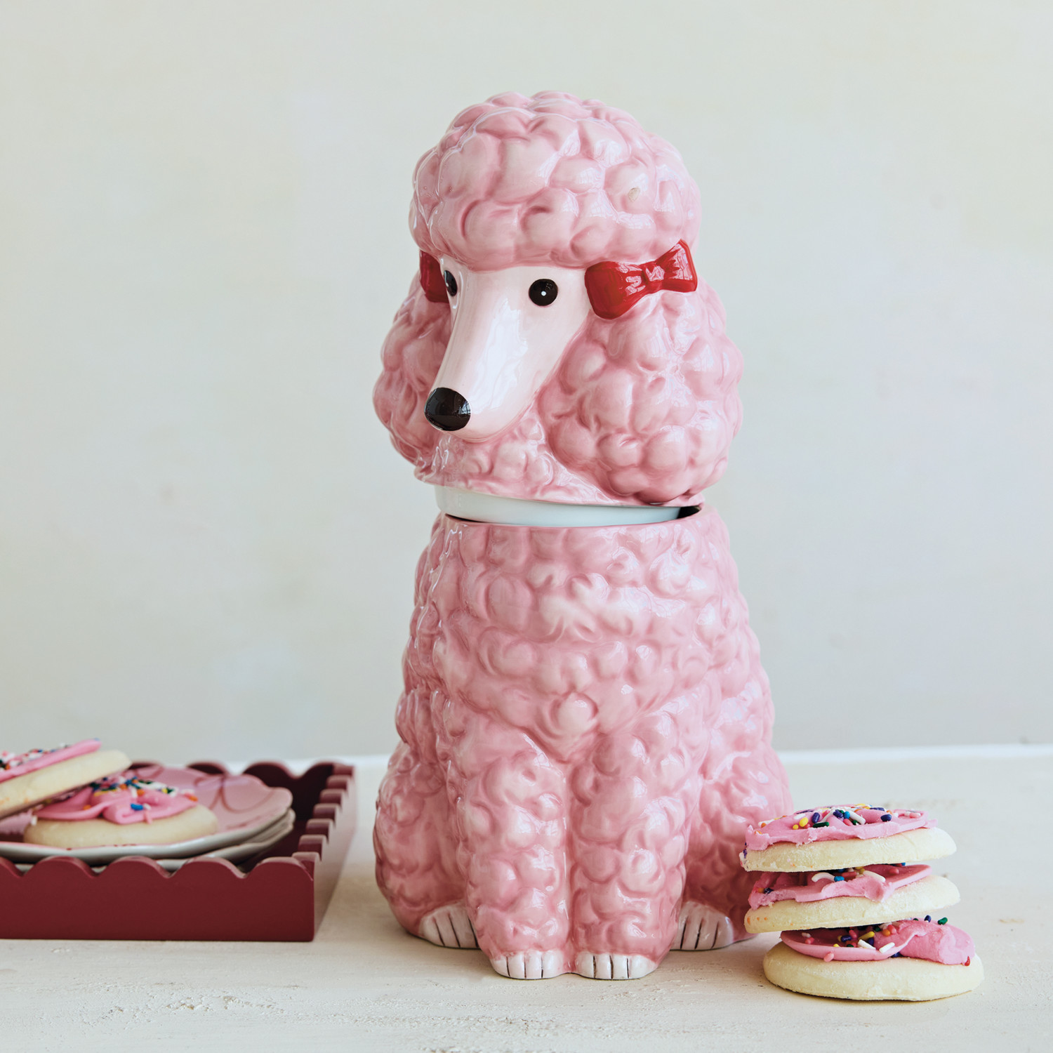 Ceramic Poodle Shaped Cookie Jar with Bows, Pink, Red & Black