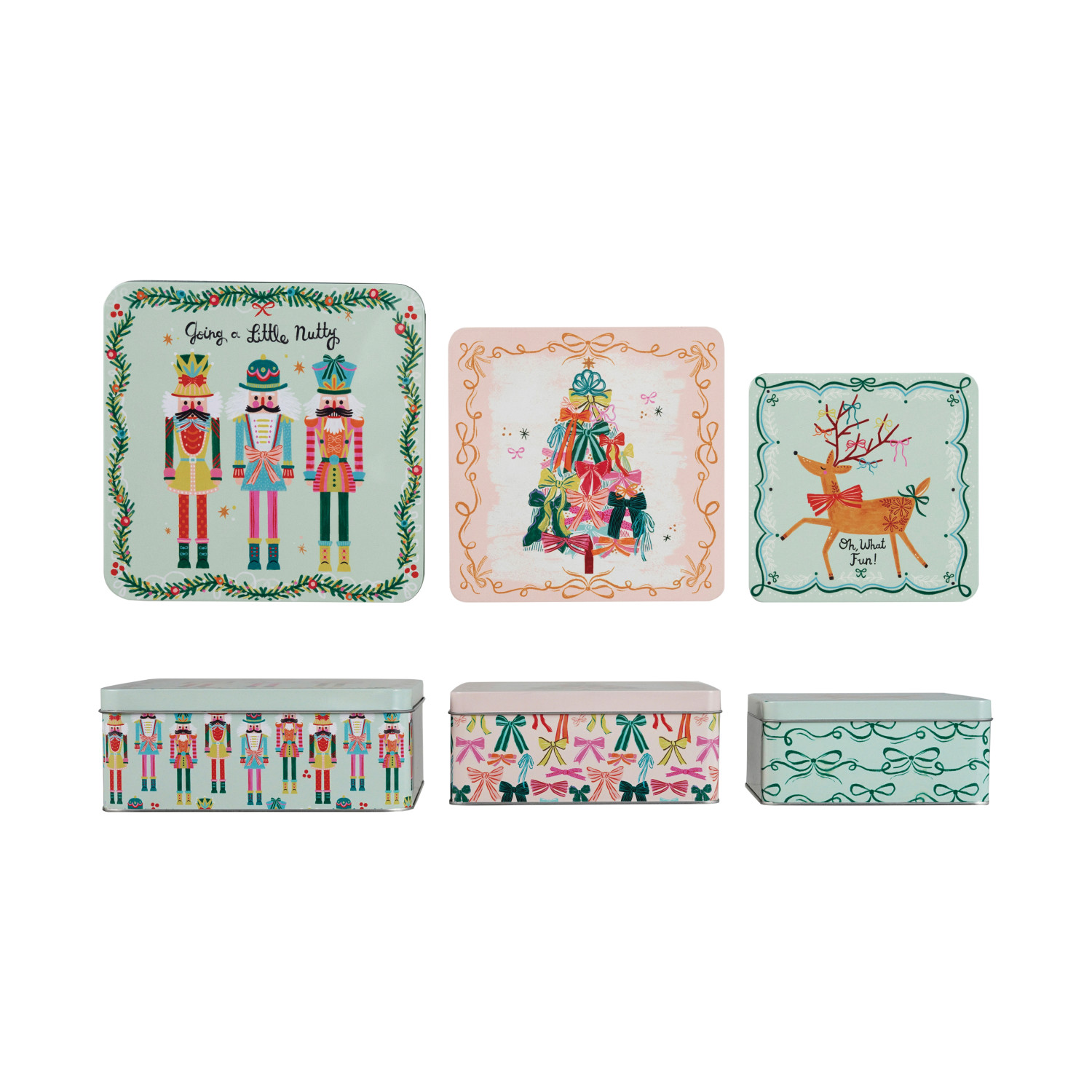 Catalog Name: 8-1/4" Square x 3-1/4"H, 7" Square x 3"H & 6" Square x 2-3/4"H Embossed Tins w/ Lids & Patterns, Multi Color, Set of 3 ©