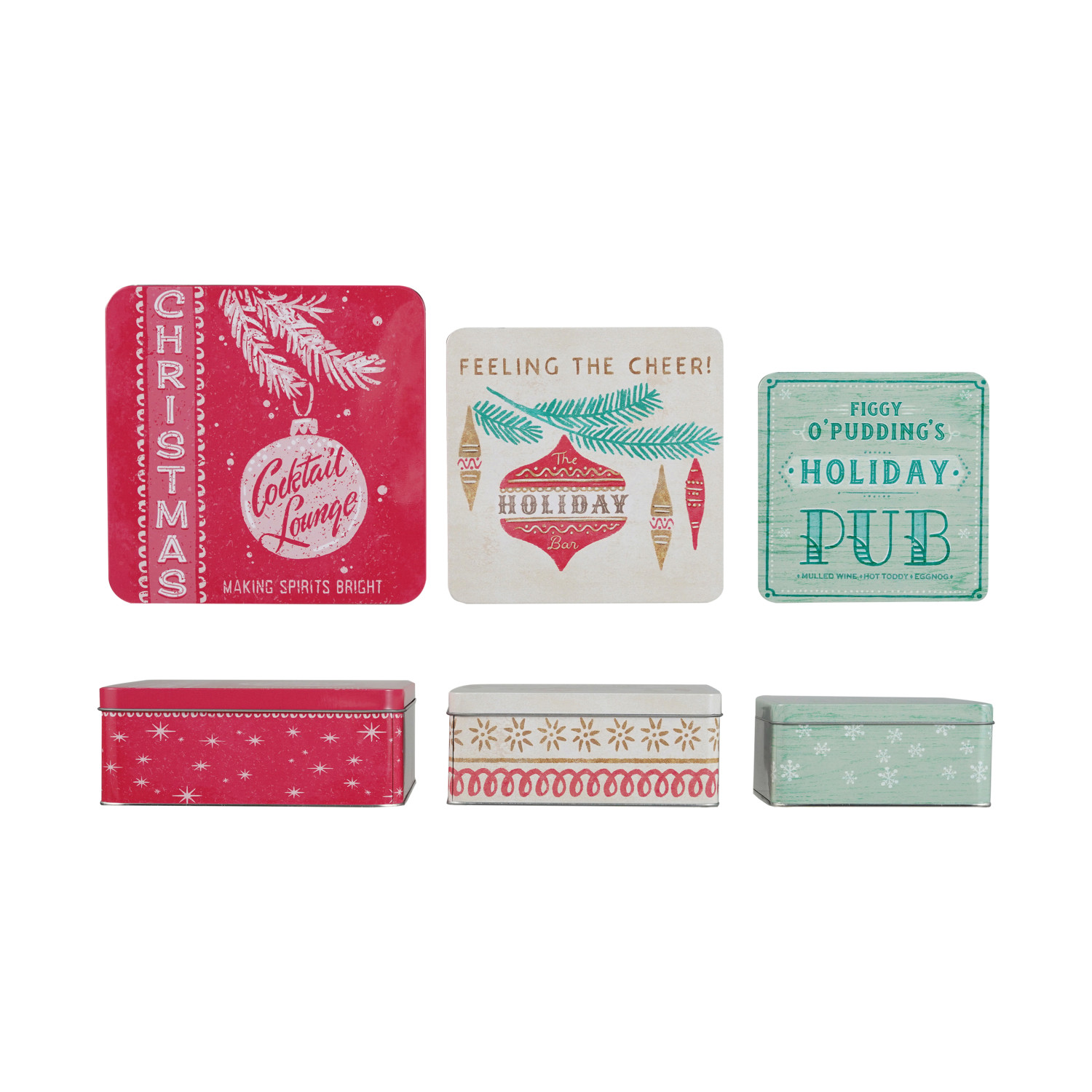 Catalog Name: 8-1/4" Square x 3-1/4"H, 7" Square x 3"H & 6" Square x 2-3/4"H Embossed Tins w/ Lids, Holiday Bar Saying & Image, Multi Color, Set of 3 ©