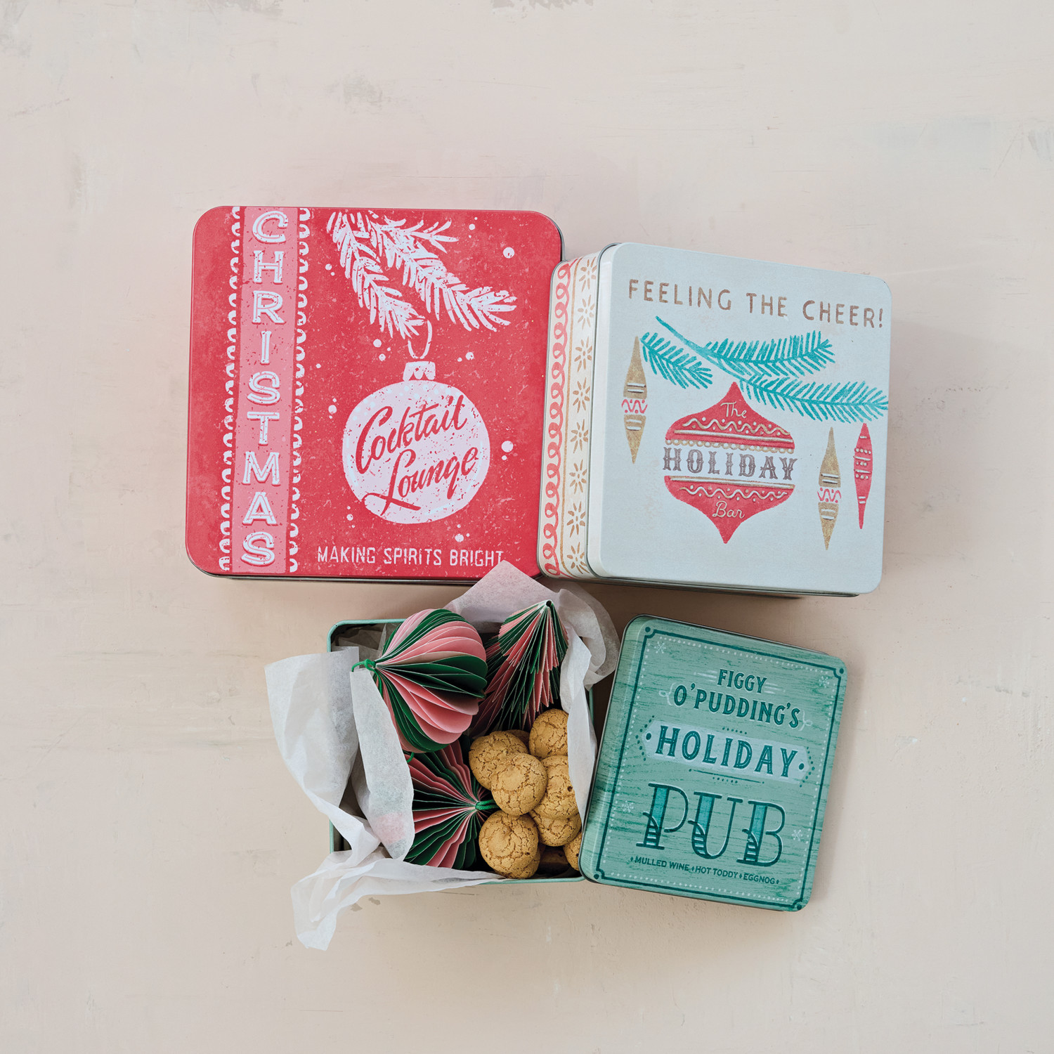 Embossed Tins with Lids, Holiday Bar Saying & Image, Set of 3 ©