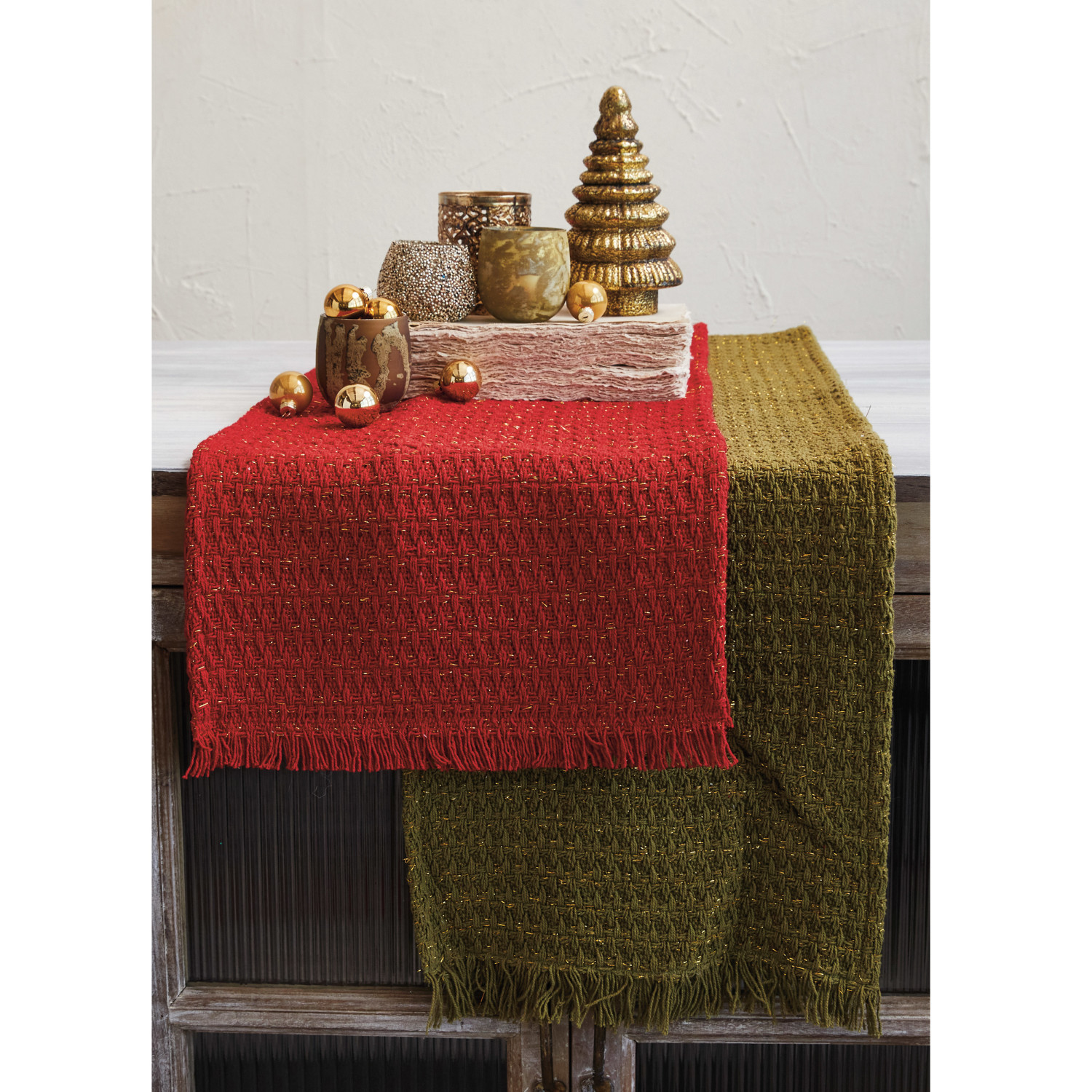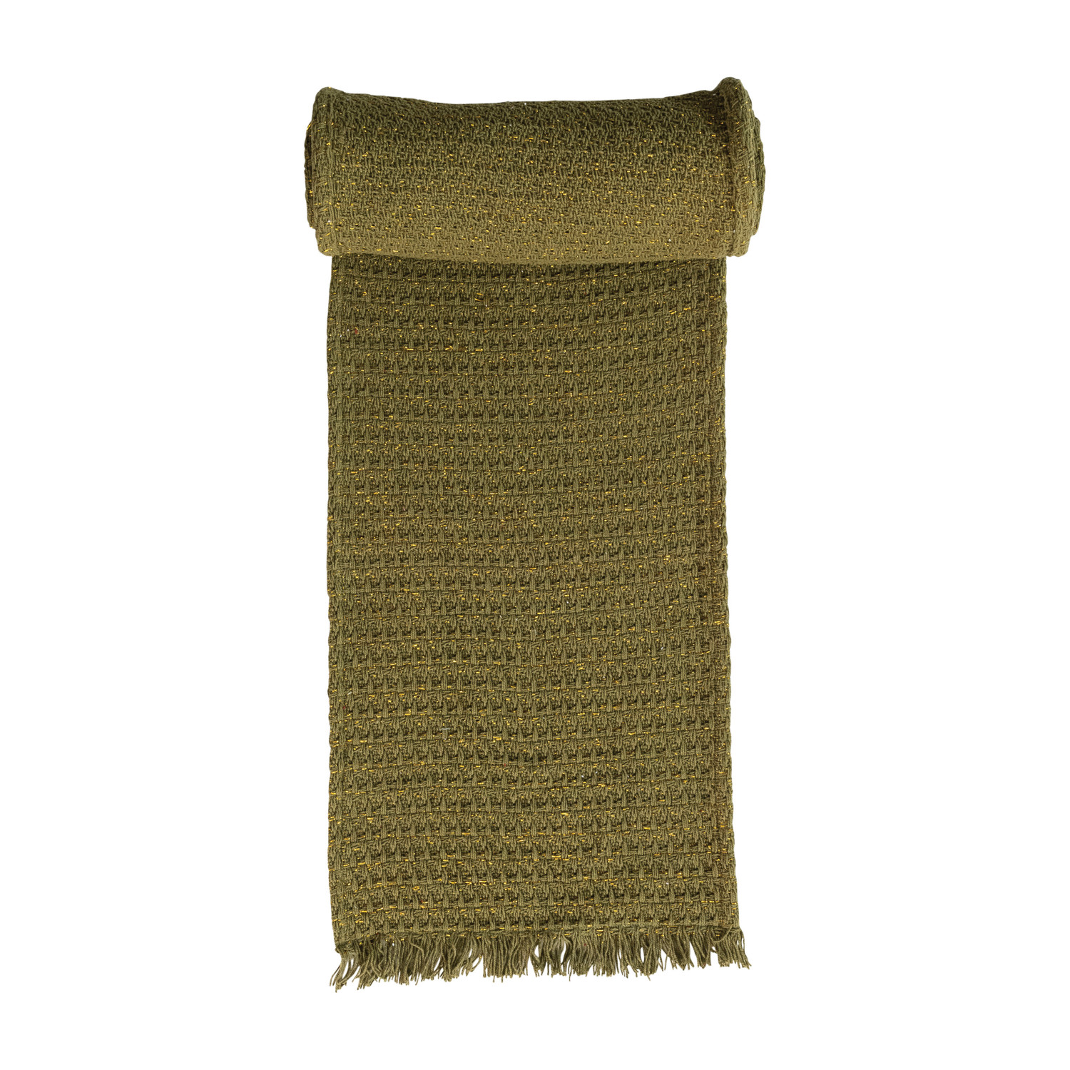 Woven Cotton Table Runner w/ Metallic Gold Thread & Fringe, Green