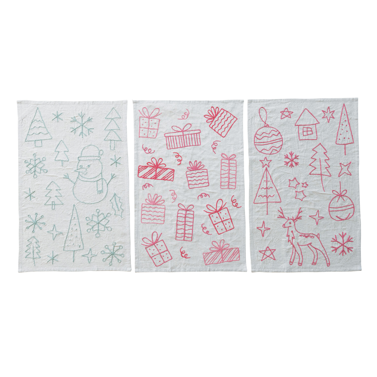 Catalog Name: 28"L x 18"W Woven Cotton & Linen Tea Towel w/ Embroidered Holiday Icons, 3 Styles