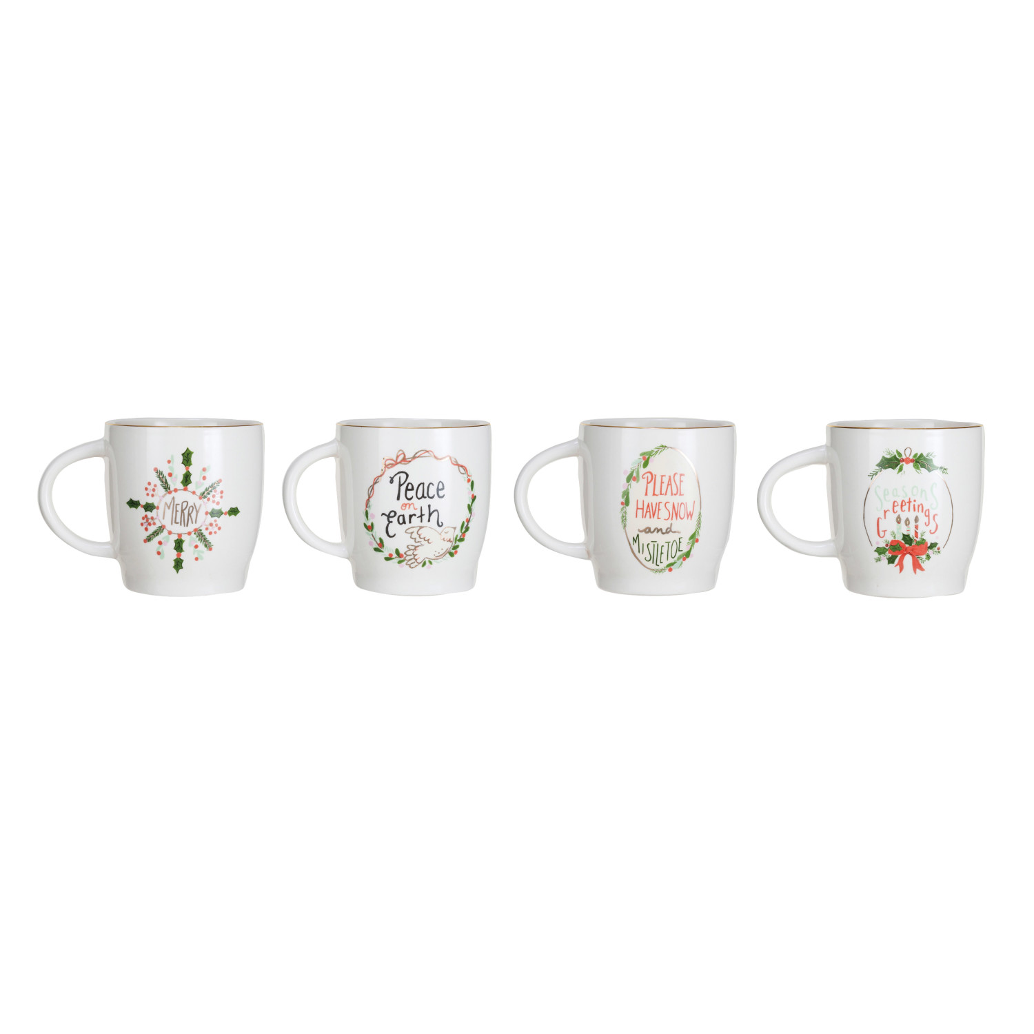 Catalog Name: 3-3/4" Round x 4"H 14 oz. Stoneware Mug w/ Holiday Saying & Gold Electroplated Rim, Multi Color, 4 Styles ©