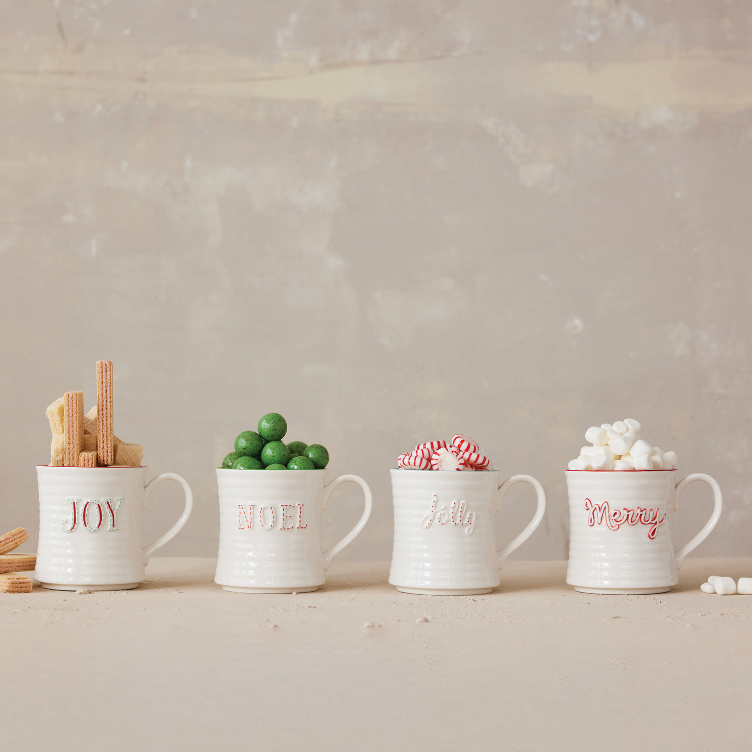 Catalog Name: 3-1/2" Round x 3-3/4"H 10 oz. Embossed Stoneware Mug w/ Colored Rim & Holiday Word, Multi Color, 4 Styles ©