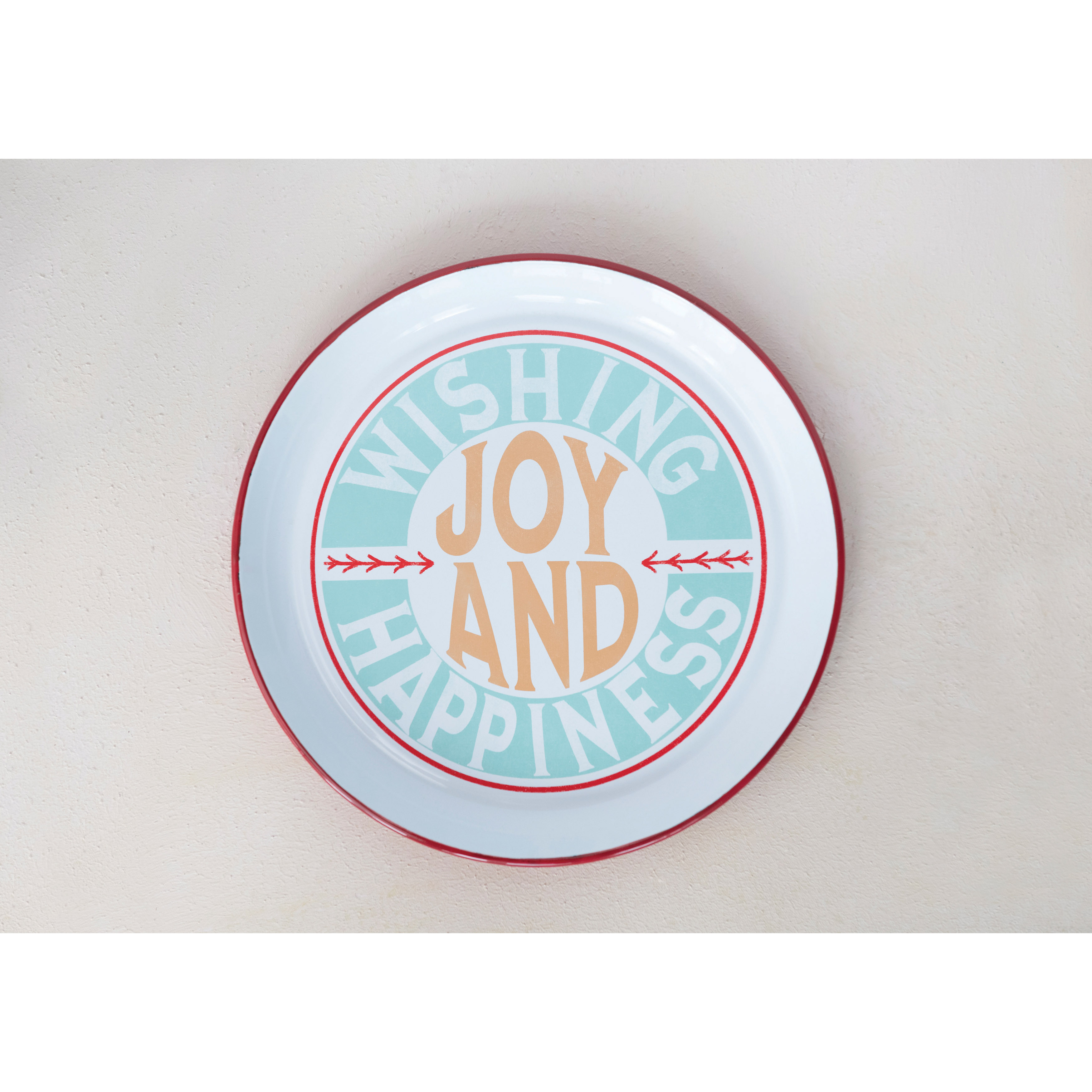 14-1/2" Round Enameled Tray with Red Rim "Wishing Joy And Happiness", Multi Color