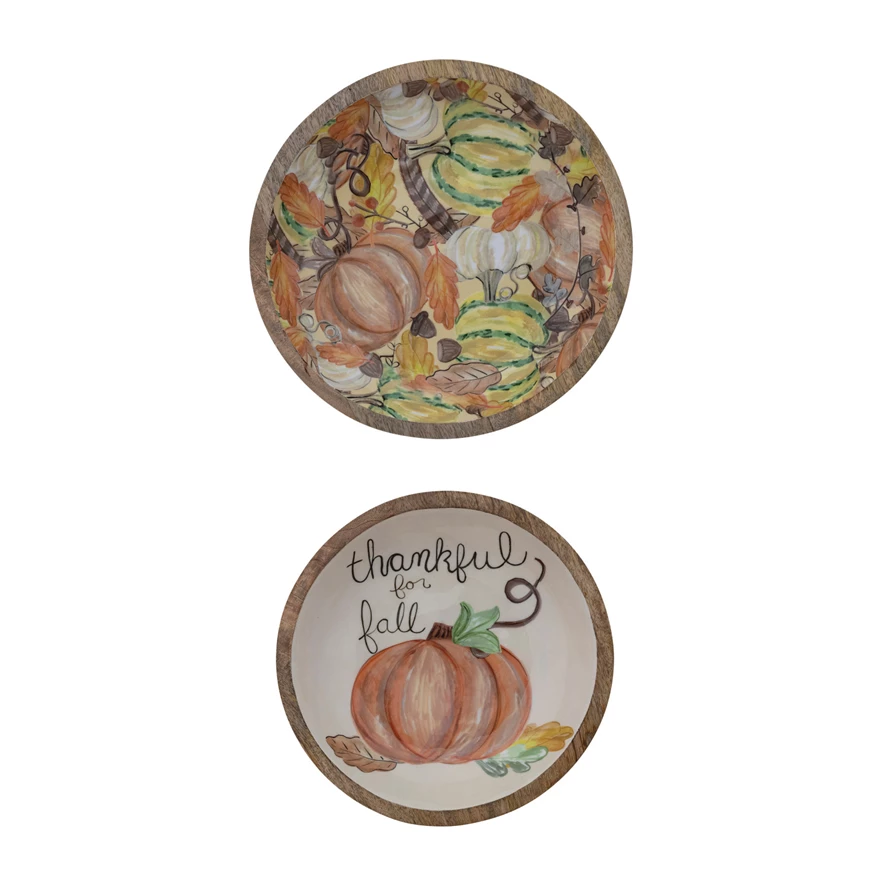 Enameled Mango Wood Bowls with Pumpkins "Thankful for Fall", Set of 2 ©