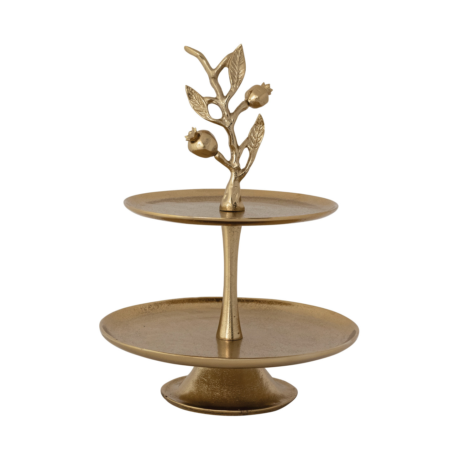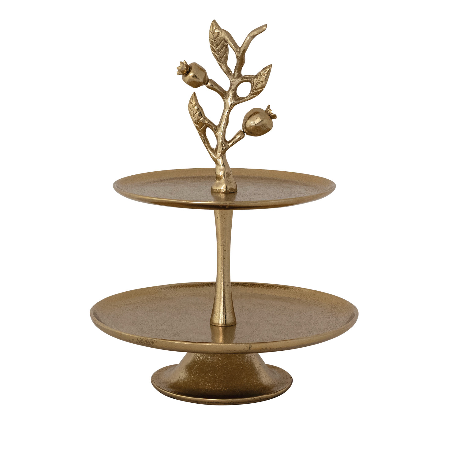 Catalog Name: 11" Round x 15"H Cast Aluminum 2-Tier Tray w/ Pomegranate Branch Shaped Handle, Gold Finish, KD