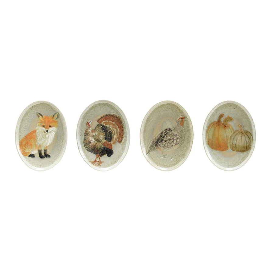 Catalog Name: 10-1/2"L x 7-1/2"W Oval Hand-Painted Stoneware Platter w/ Animal/Pumpkins, Reactive Crackle Glaze, Multi Color, 4 Styles (Each One Will Vary)