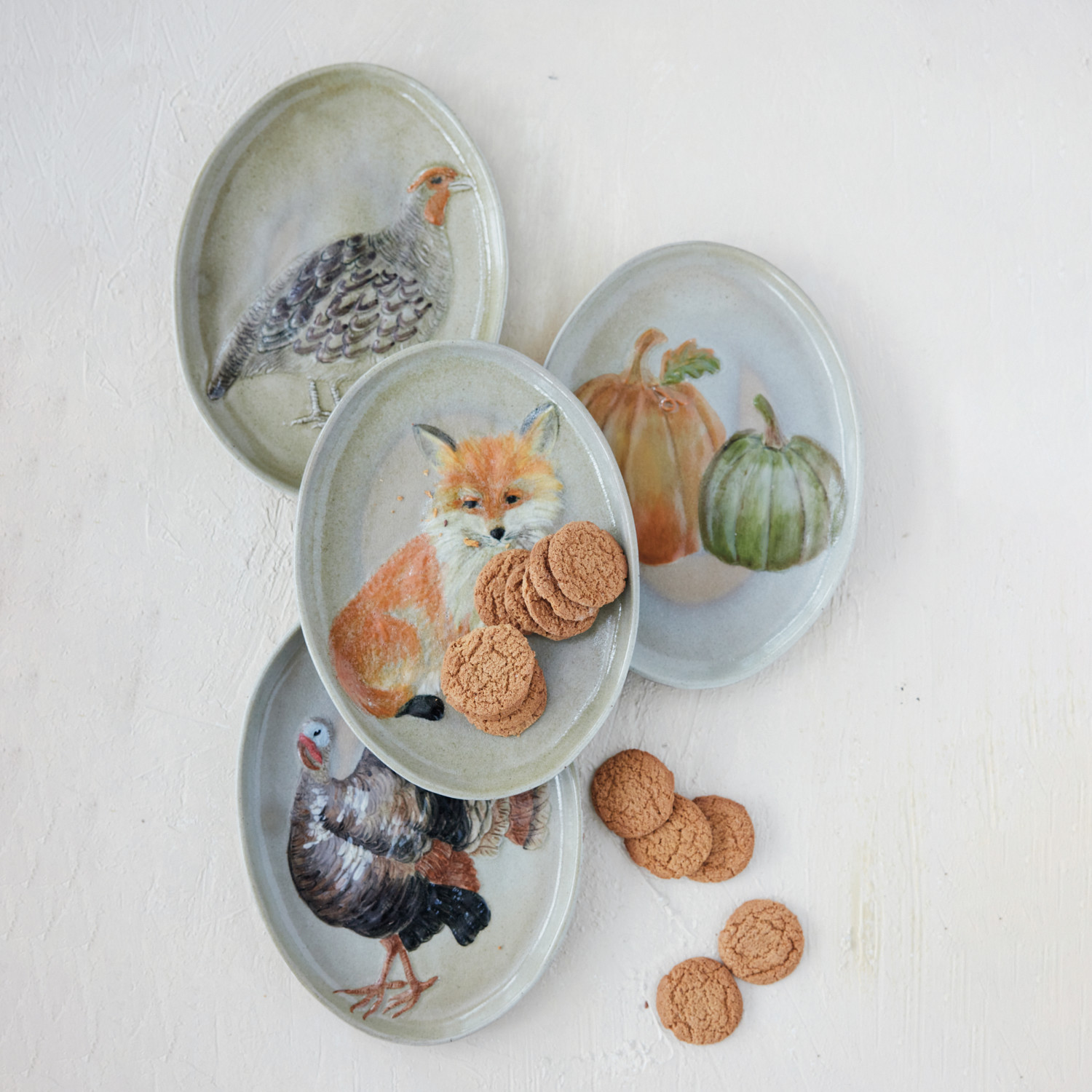 Hand-Painted Stoneware Platter with Animal/Pumpkins, 4 Styles (Each One Will Vary)