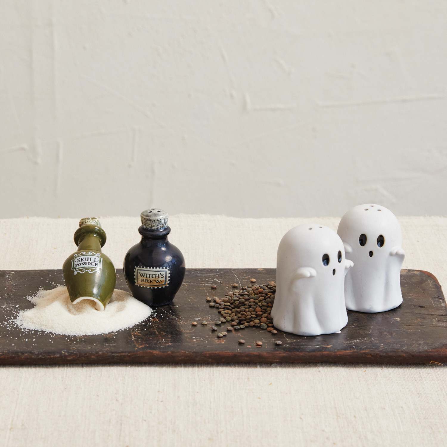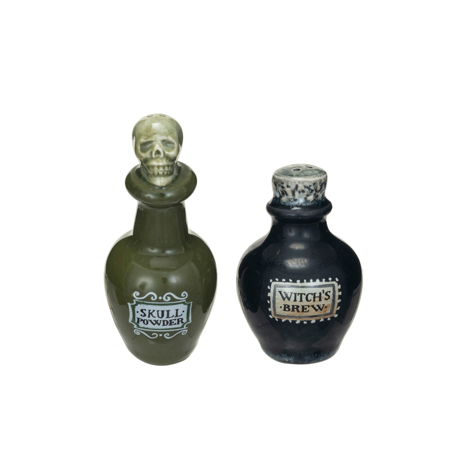 Catalog Name: 1-3/4" Round x 3"H & 1-1/2" Round x 4"H Stoneware Potion Bottle Salt & Pepper Shakers "Skull Powder" & "Witch's Brew", Green & Black, Set of 2 ©