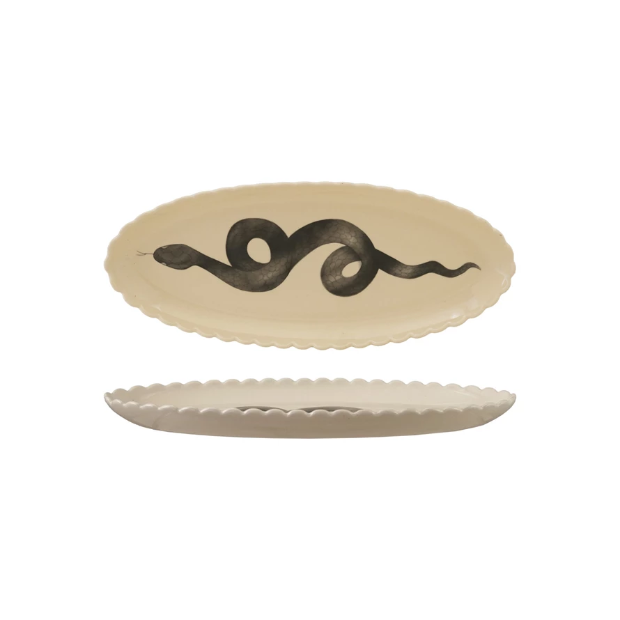 Stoneware Scalloped Platter with Snake, White & Black