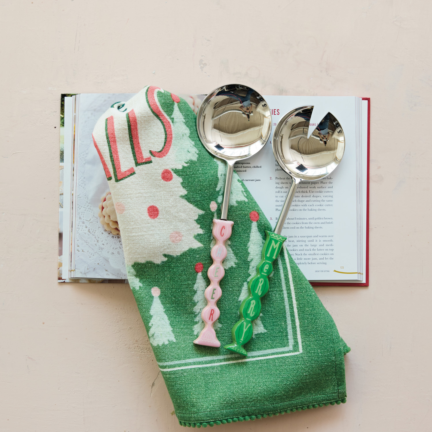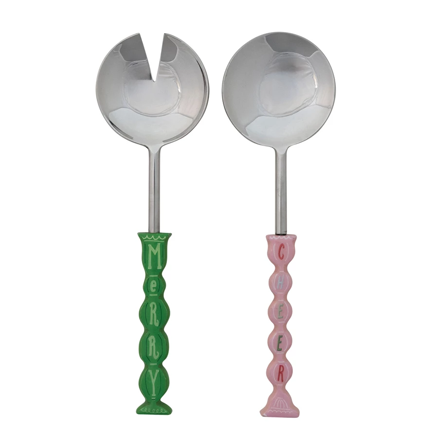 Enameled Metal Salad Servers with Holiday Words & Colored Handles "Merry/Cheer", Set of 2 ©
