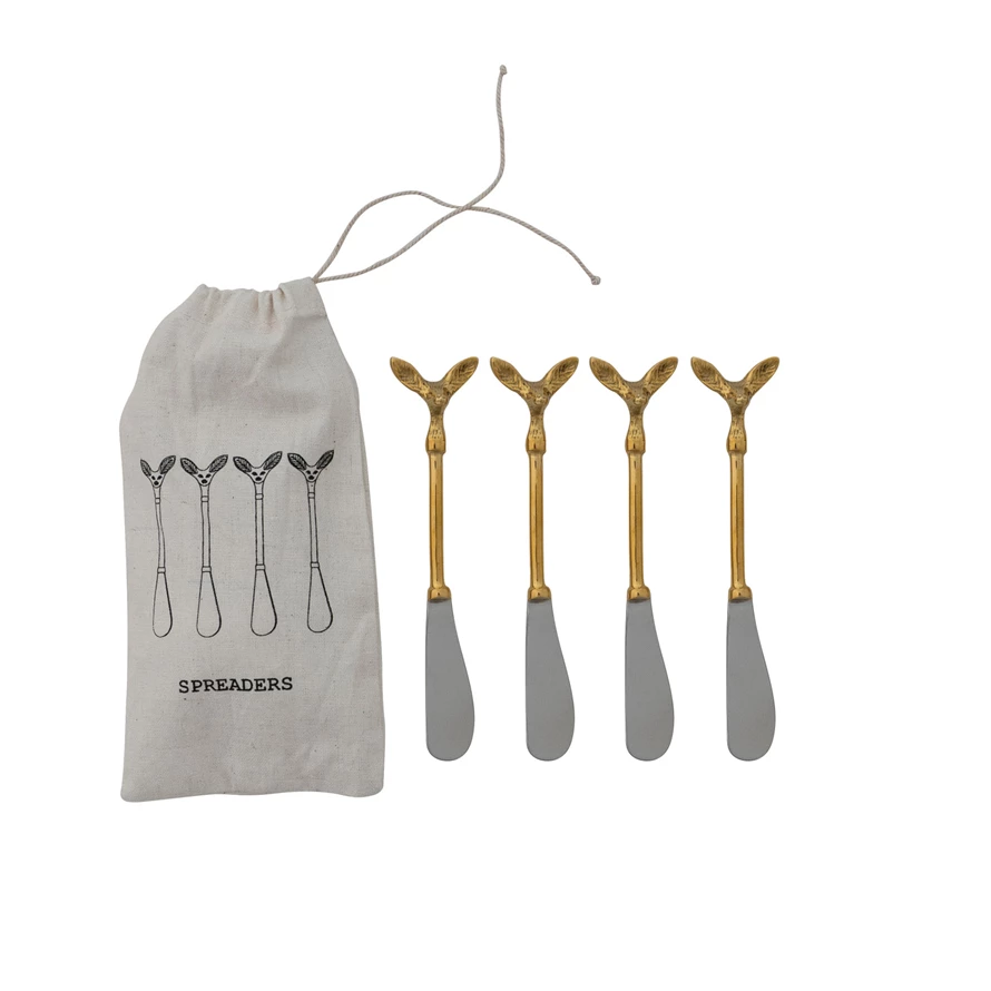 Catalog Name: 5-1/4"L Stainless Steel & Brass Canape Knives w/ Deer Head Handles, Set of 4 in Printed Drawstring Bag