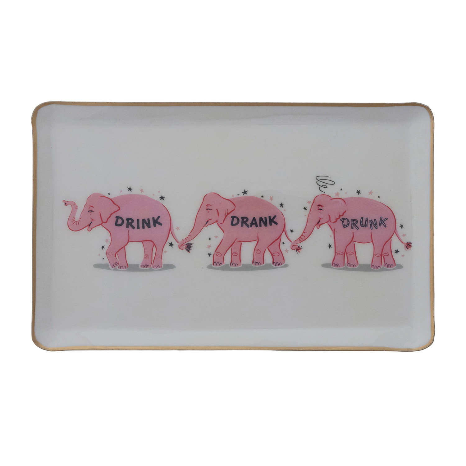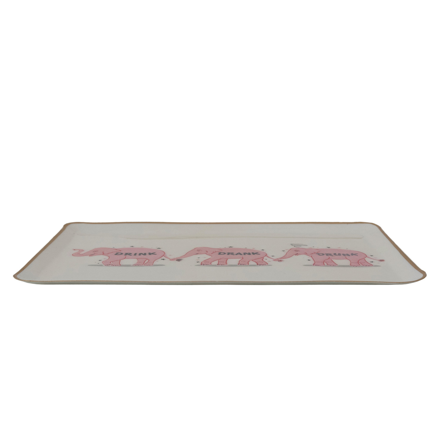 Catalog Name: 13"L x 8"W Enameled Metal Tray w/ Pink Elephants & Gold Edge "Drink, Drank, Drunk", Multi Color ©