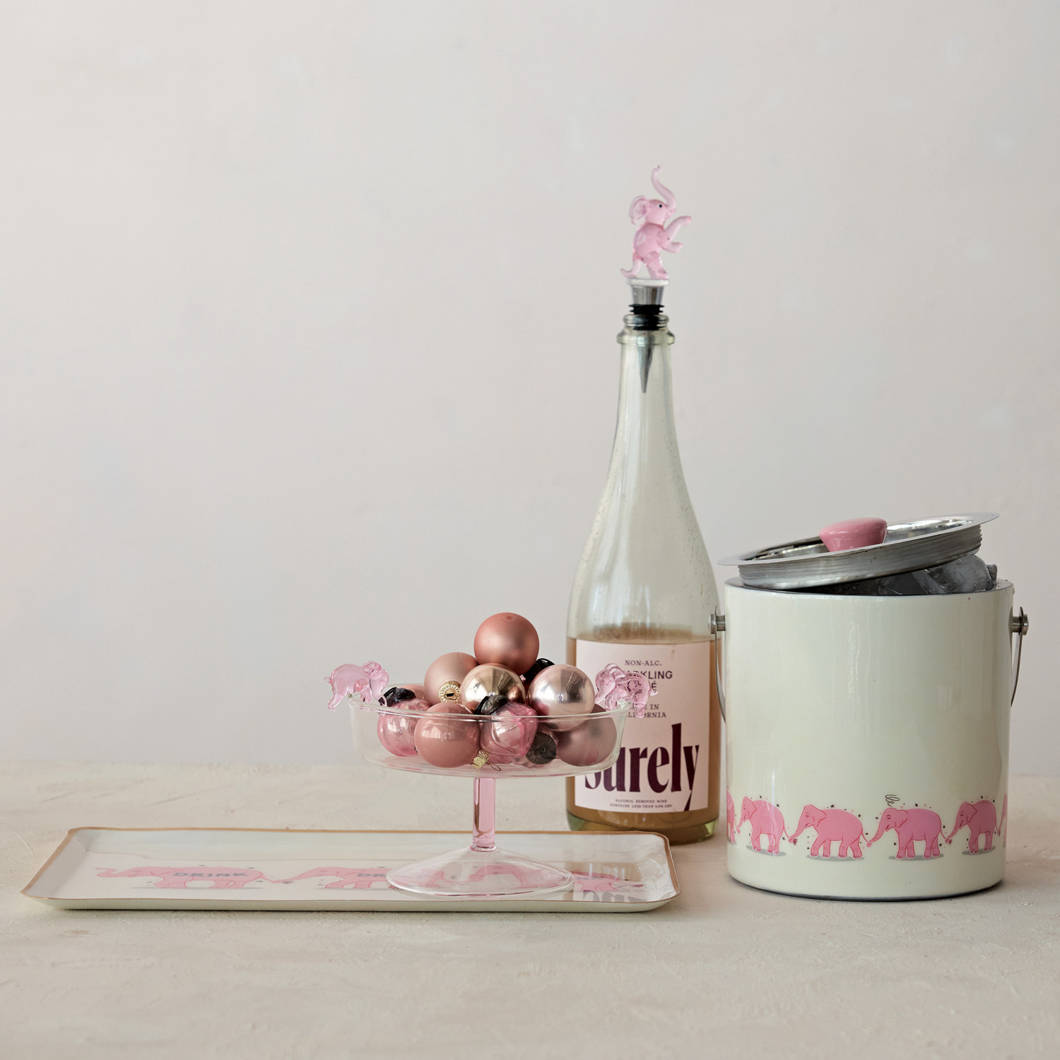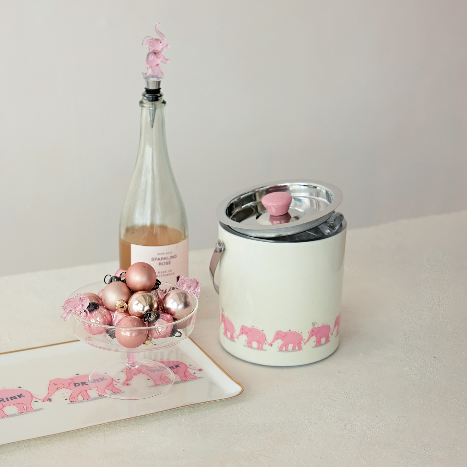 Enameled Metal Tray with Pink Elephants & Gold Edge "Drink, Drank, Drunk" ©