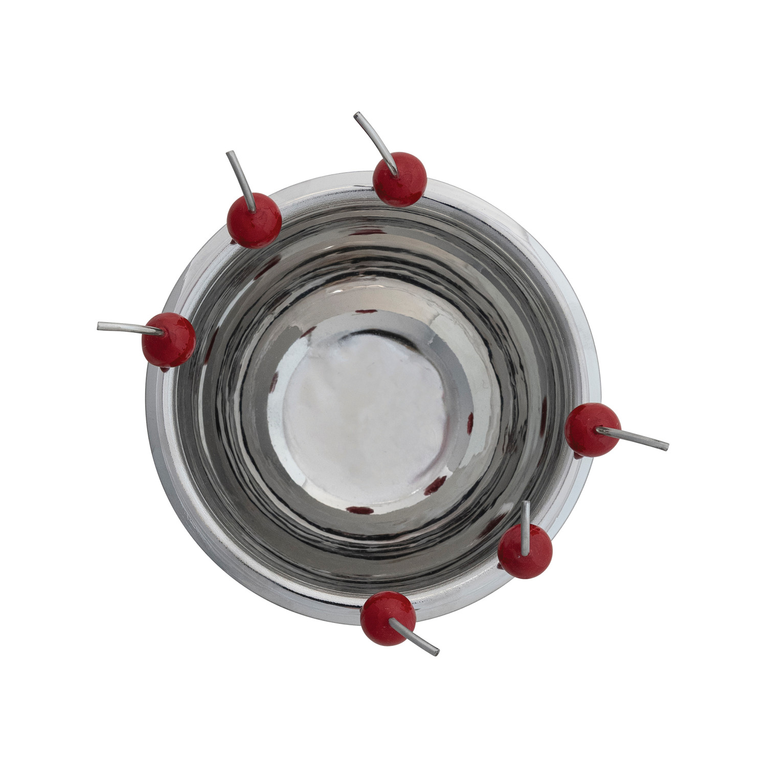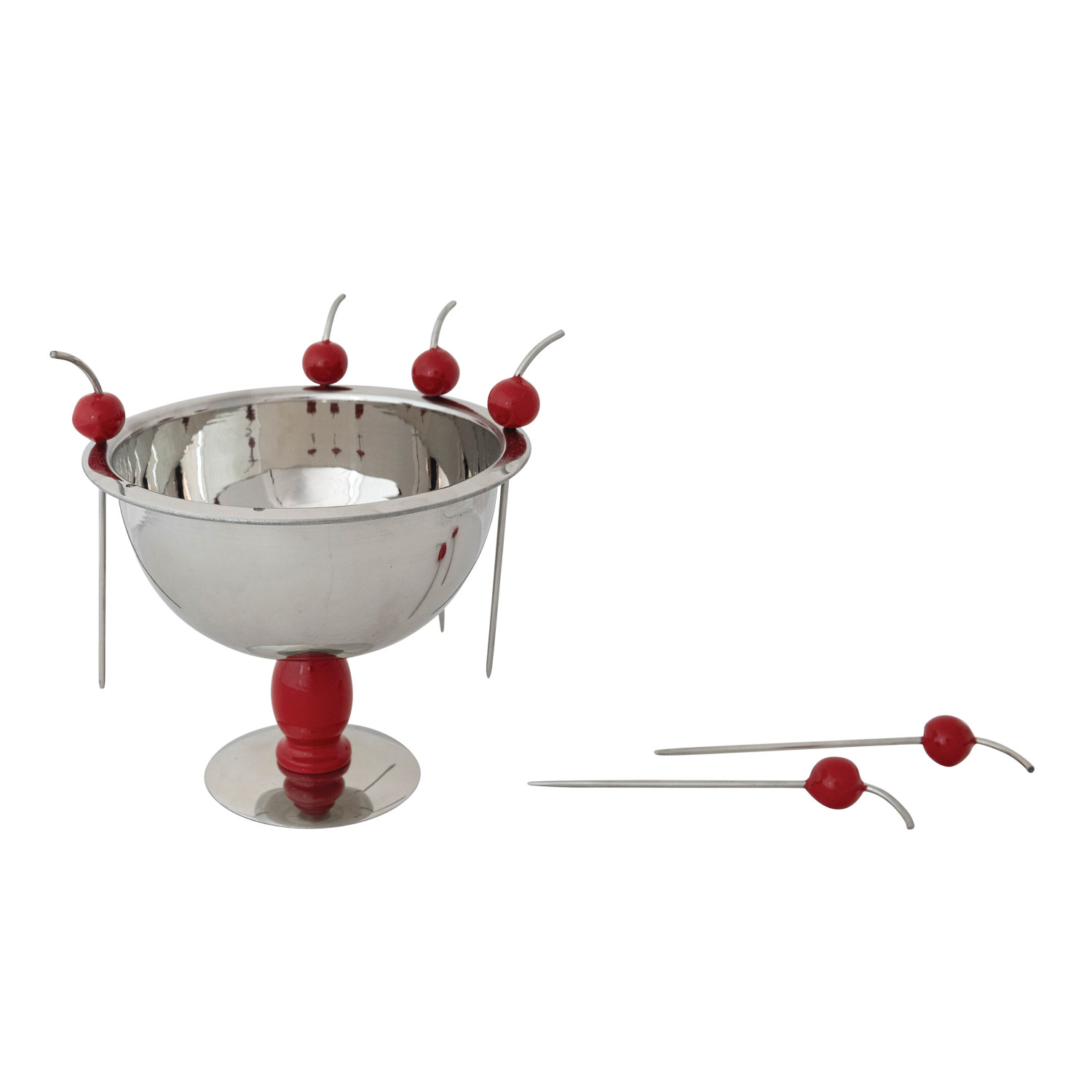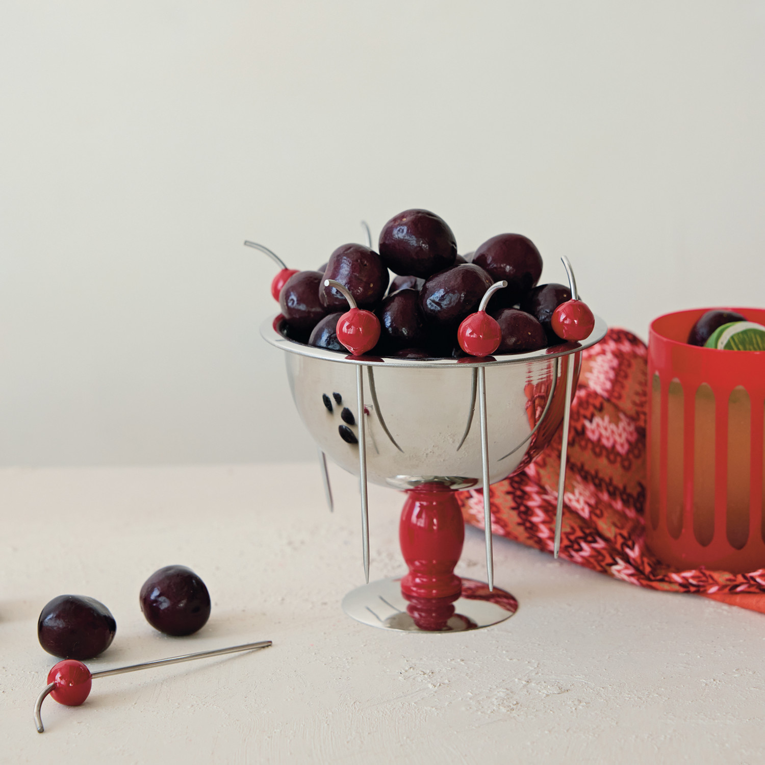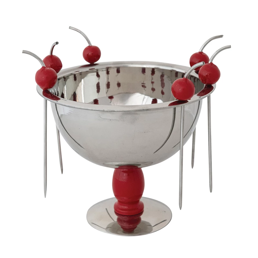 Catalog Name: 5-3/4" Round x 4-3/4"H Enameled Stainless Steel Footed Bowl w/ (6) 4-3/4"L Appetizer Picks w/ Cherry Shaped Appitizer Picks on Rim, Red, Set of 7