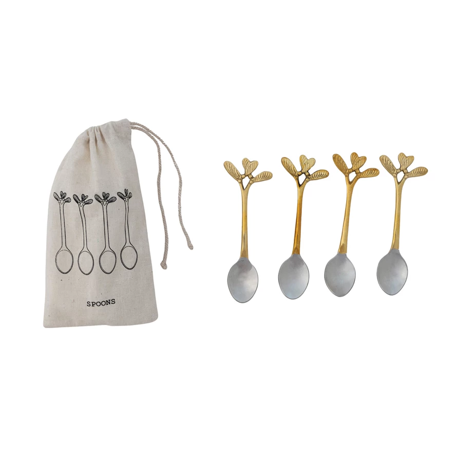 Stainless Steel & Brass Coffee Spoons, Set of 4 in Printed Drawstring Bag