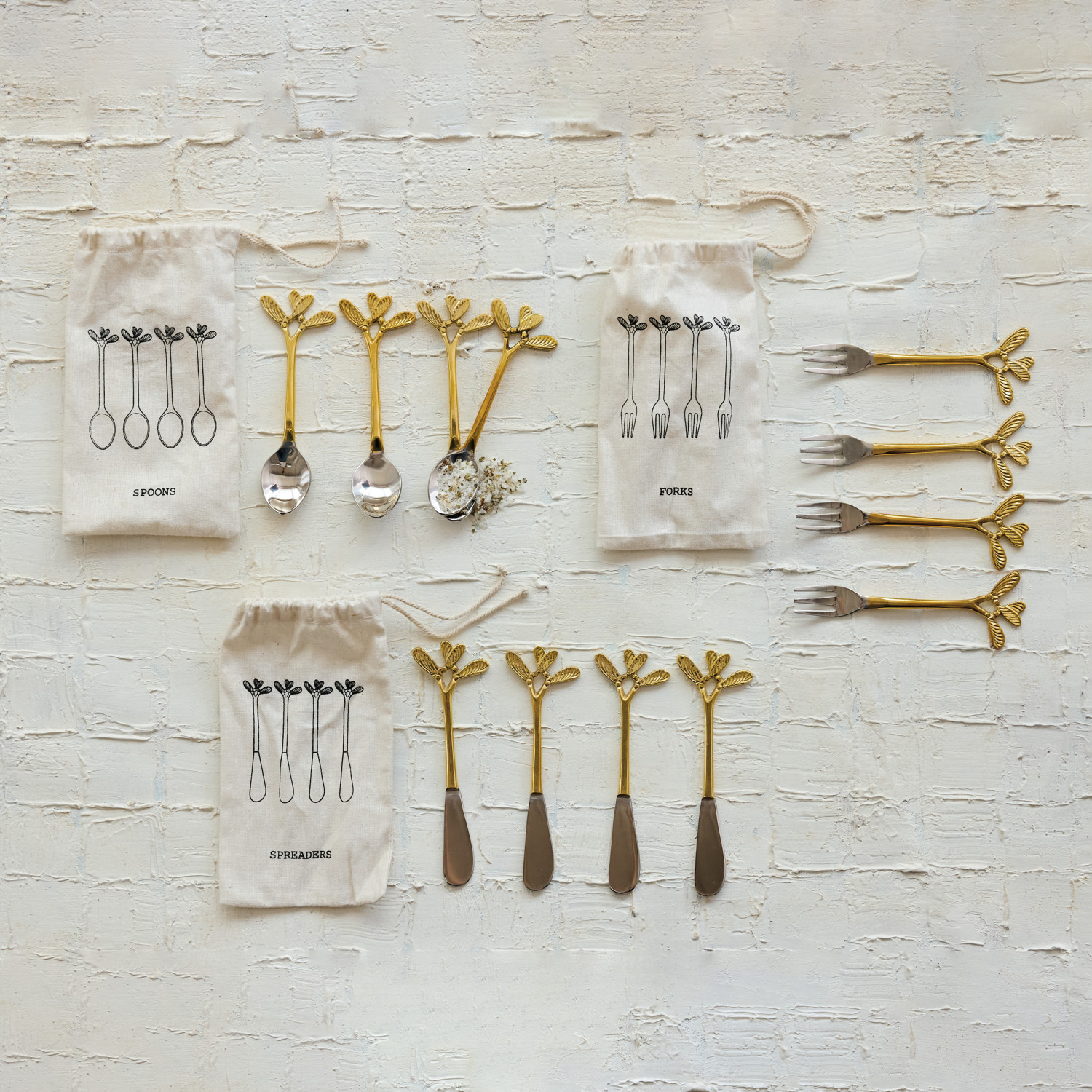 Catalog Name: 5-1/2"L Stainless Steel & Brass Appetizer Forks w/ Mistletoe Leaves & Berries Handles, Set of 4 in Printed Drawstring Bag