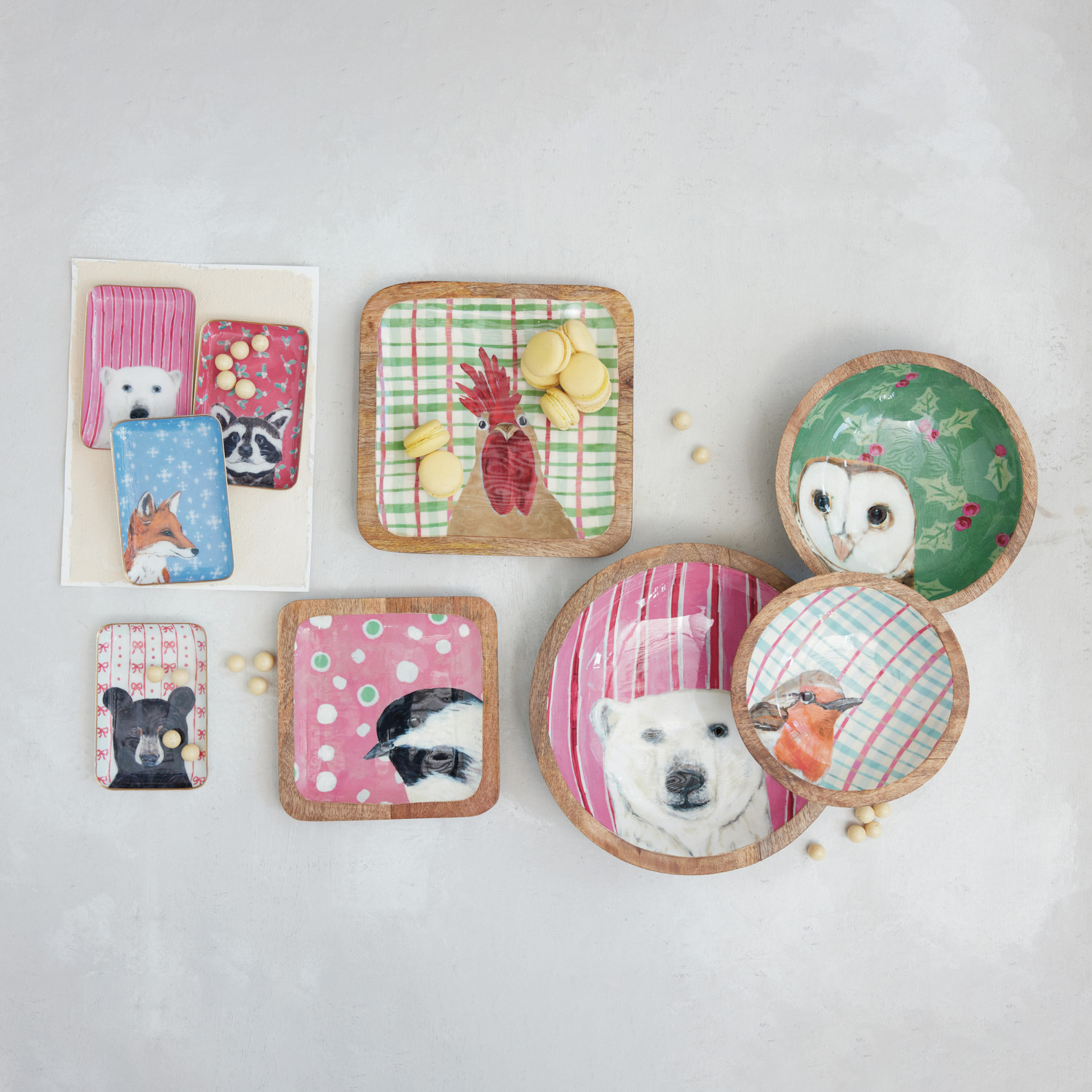 Enameled Mango Wood Bowls with Holiday Patterns & Animals, Set of 3 ©
