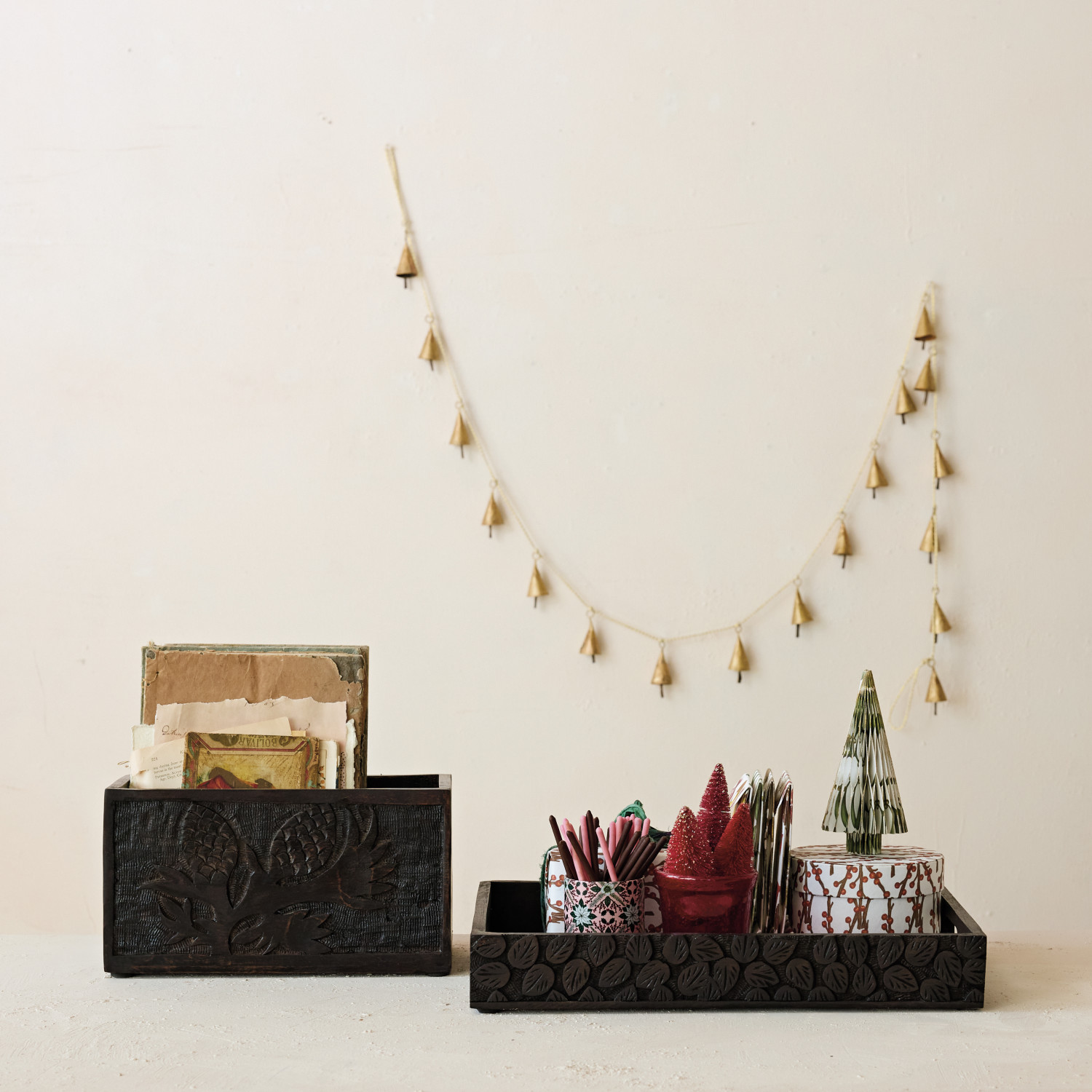 Hand-Carved Mango Wood Tray with Leaves & Handles, Espresso Finish