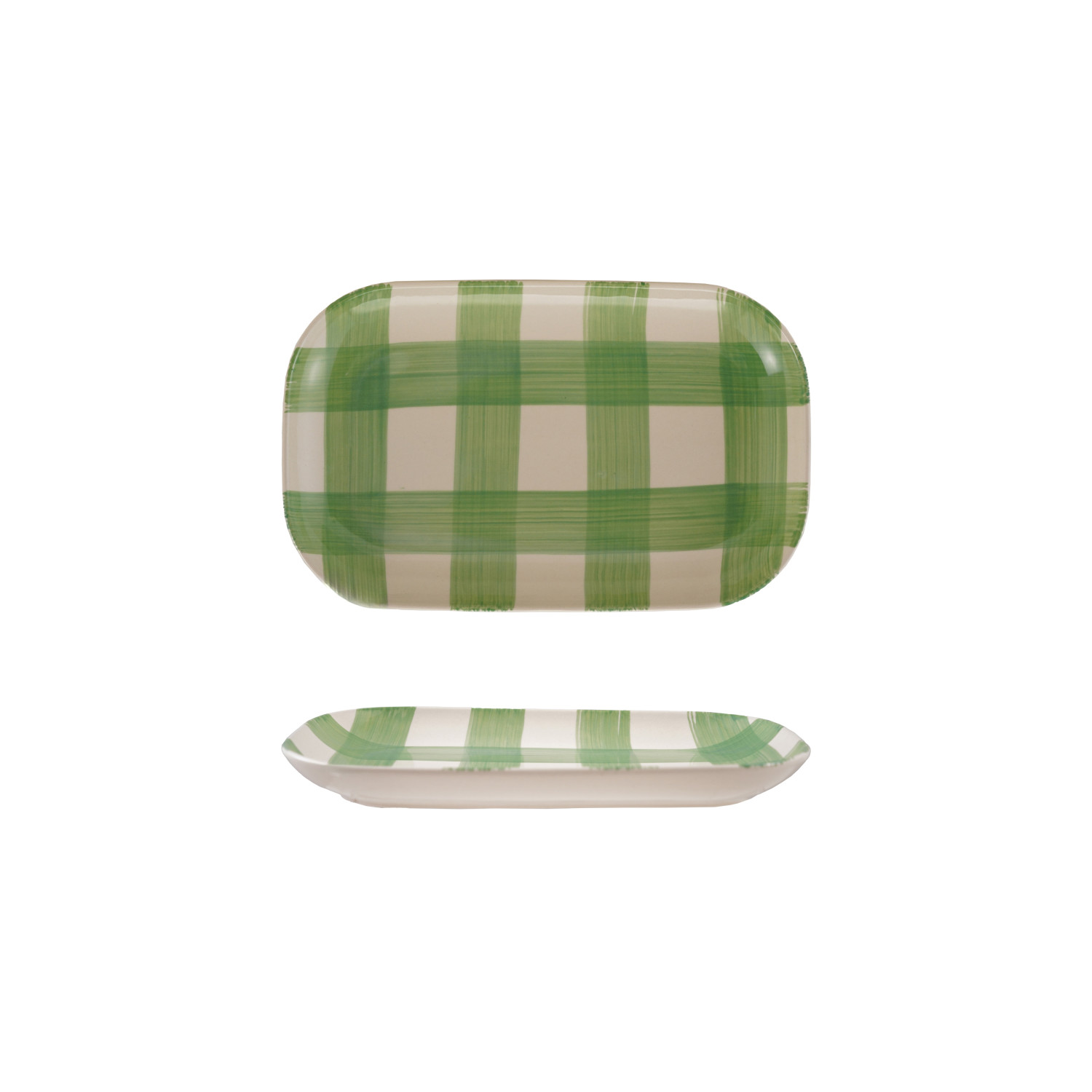 Catalog Name: 12-1/4"L x 8"W Hand-Painted Stoneware Platter w/ Plaid Pattern, Green & White (Each One Will Vary)