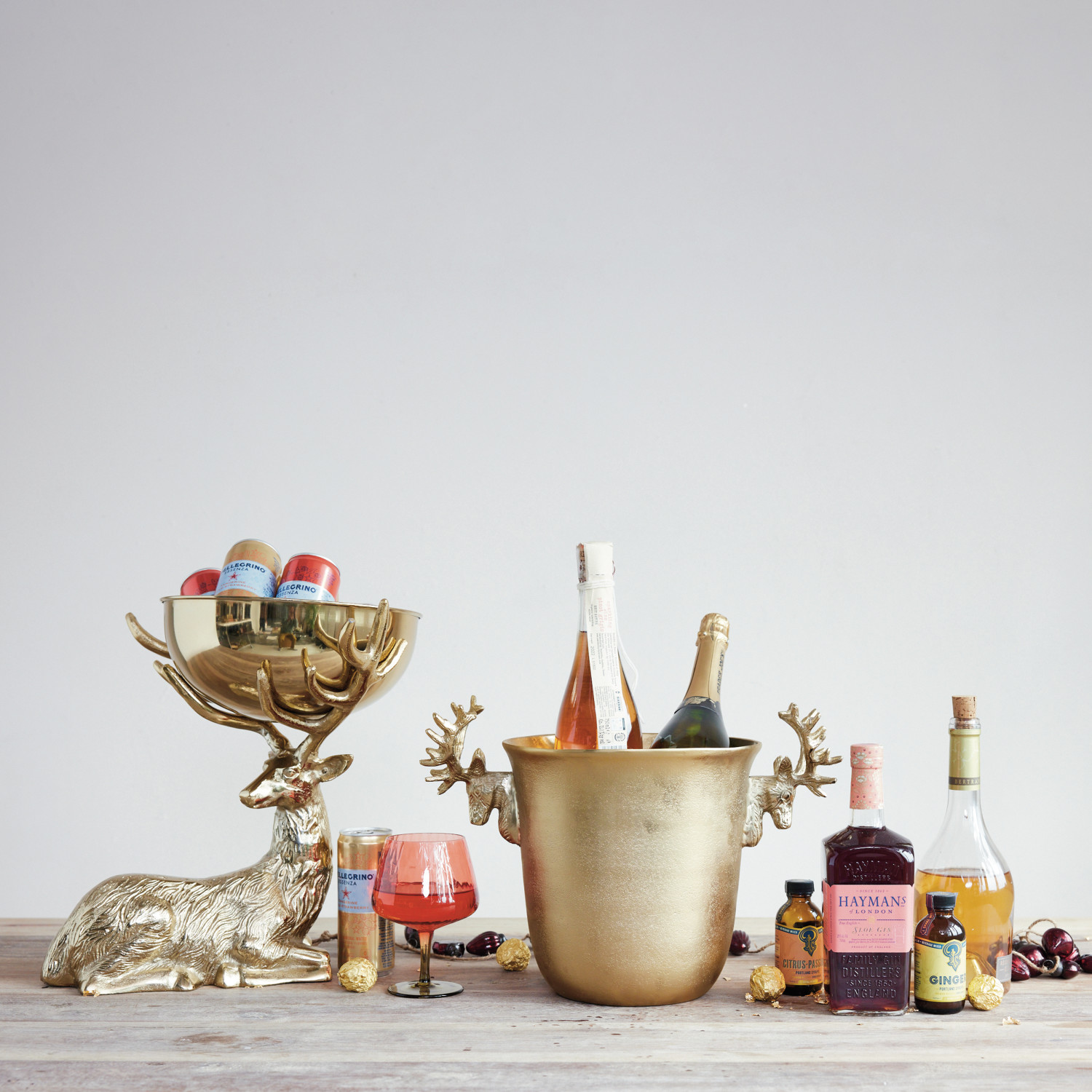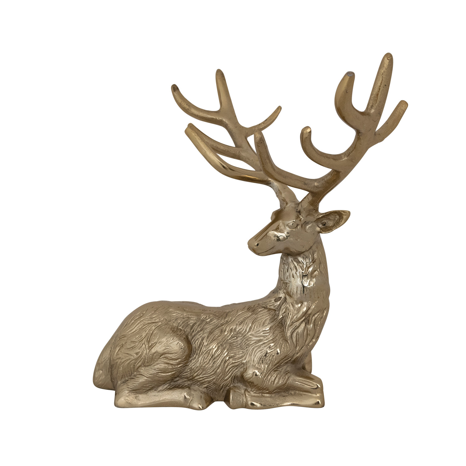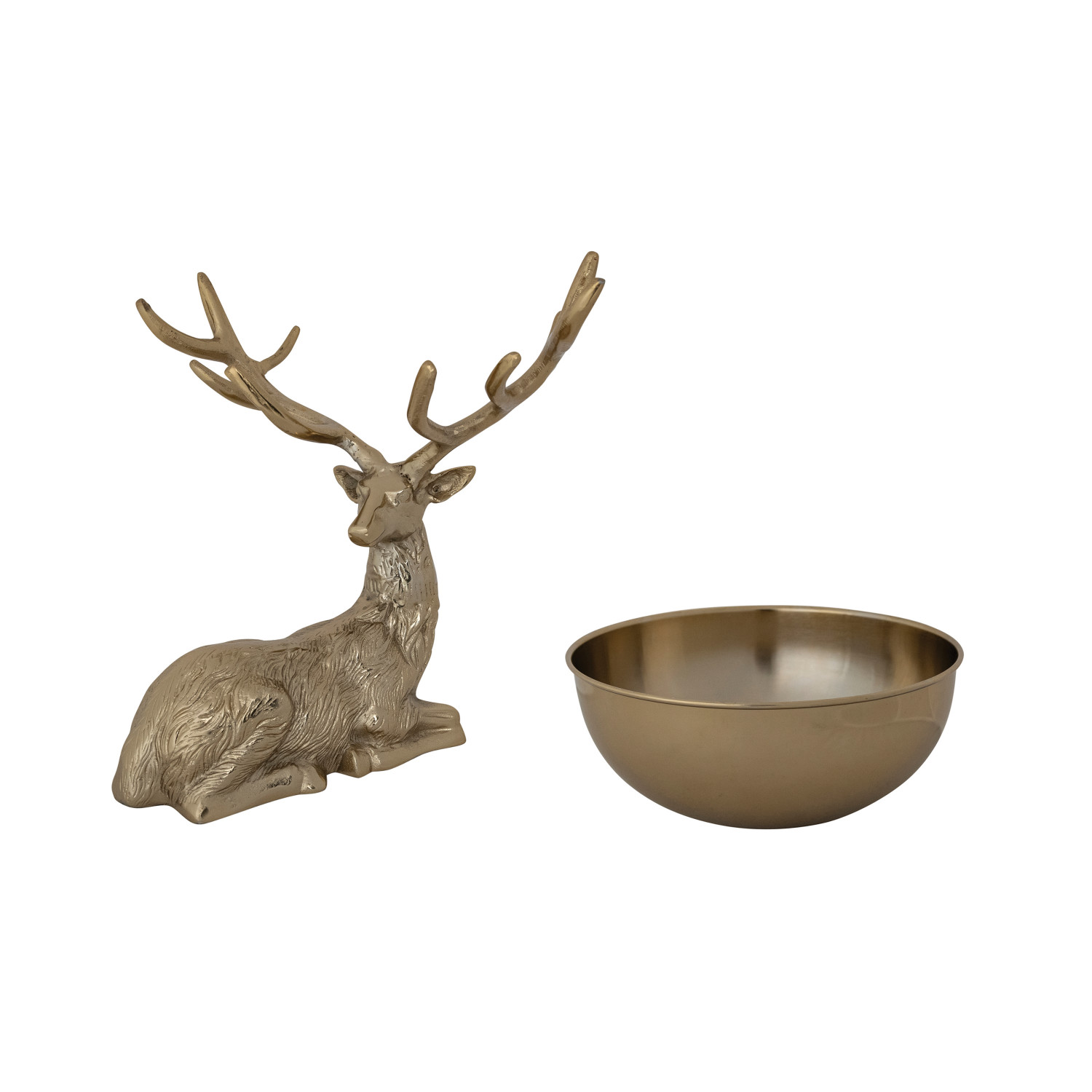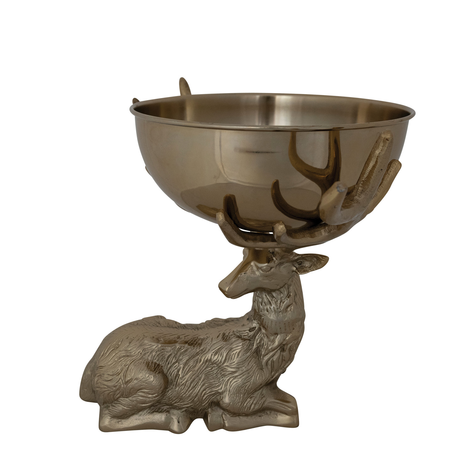 Catalog Name: 16"L x 12"W x 15"H Cast Aluminum Reindeer w/ Antlers Holding 10-1/4" Round x 4-1/2"H Removable Bowl, Gold Finish, Set of 2, Truck Ship