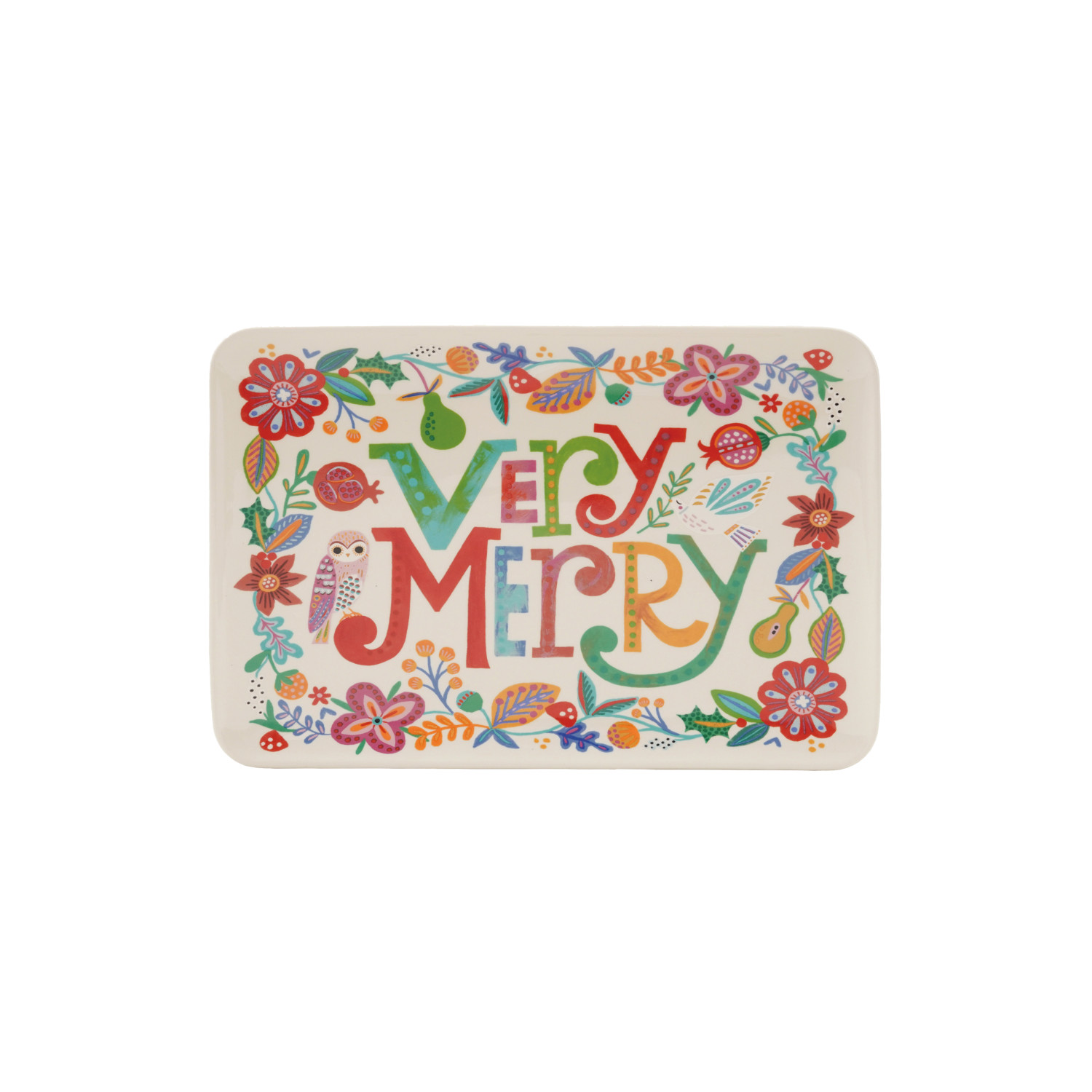 Catalog Name: 12"L x 8"W Stoneware Platter w/ Botanicals & Owl "Very Merry", Multi Color ©