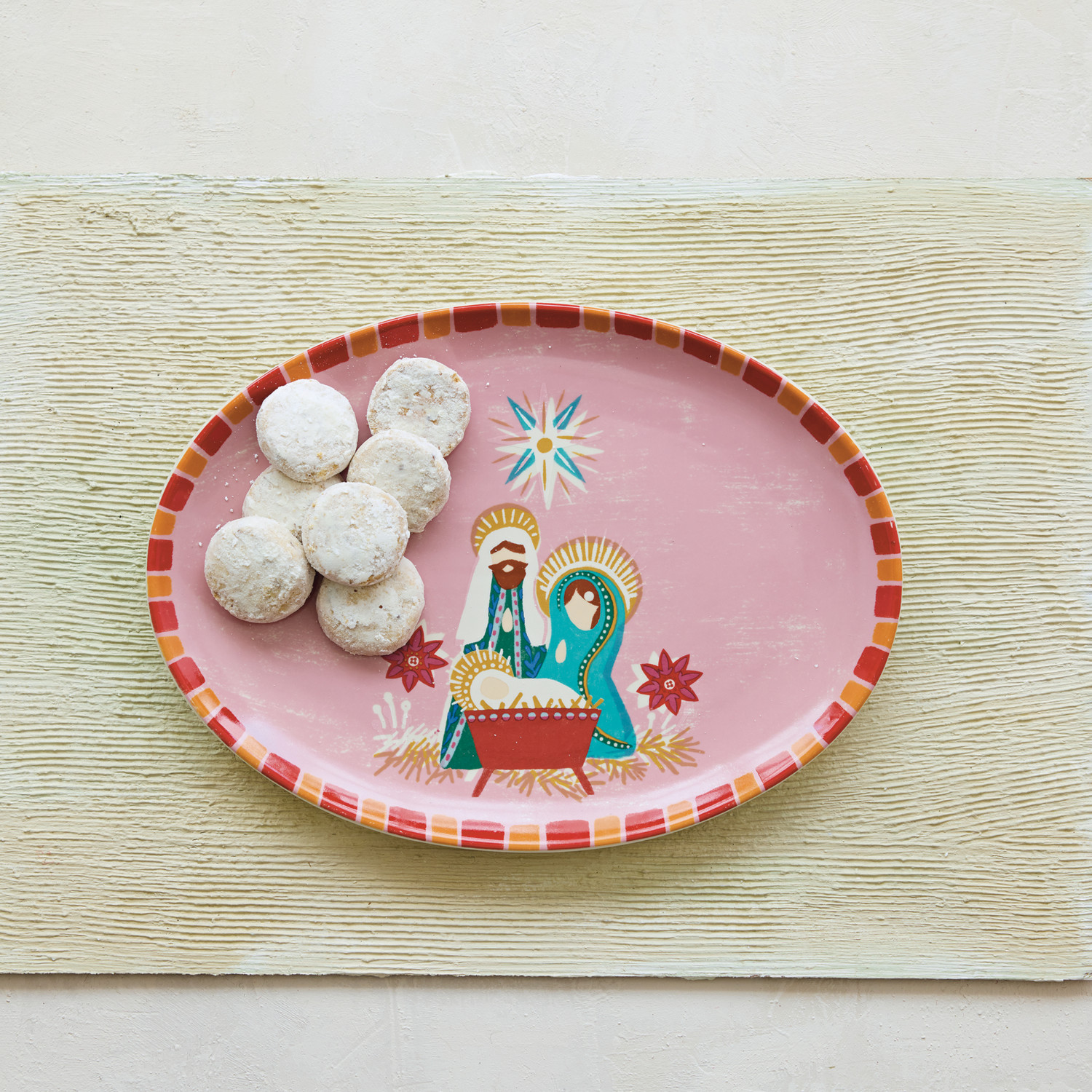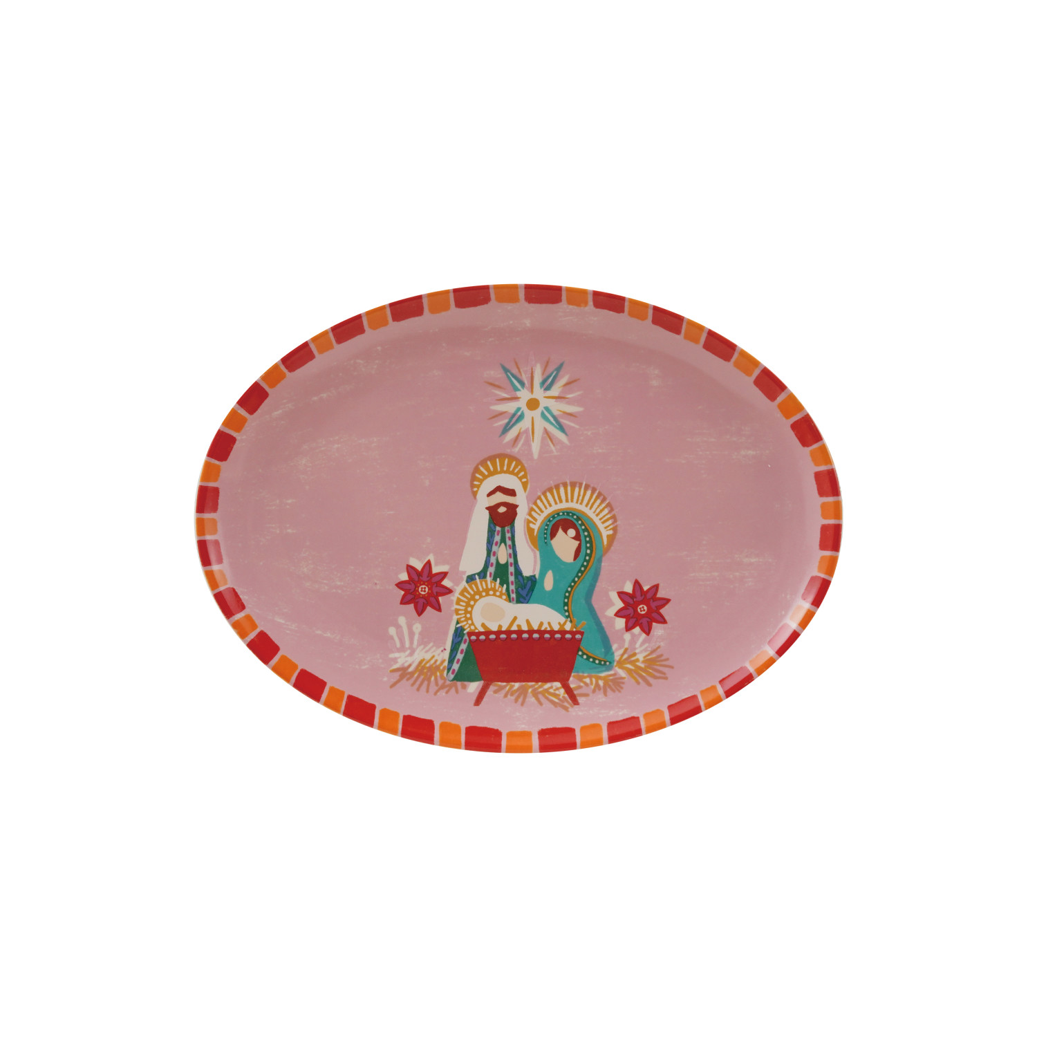 Catalog Name: 12"L x 9"W Oval Stoneware Platter w/ Holy Family & Striped Border, Multi Color ©