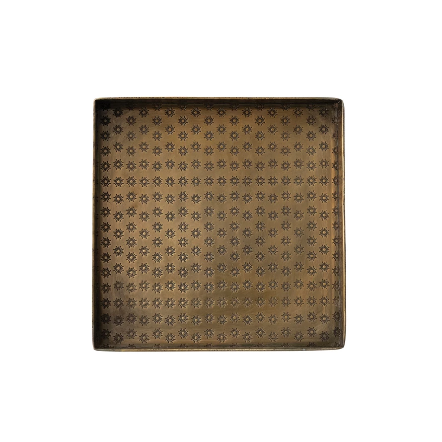 Catalog Name: 9-1/2" Square Debossed Aluminum Tray, Antique Brass Finish
