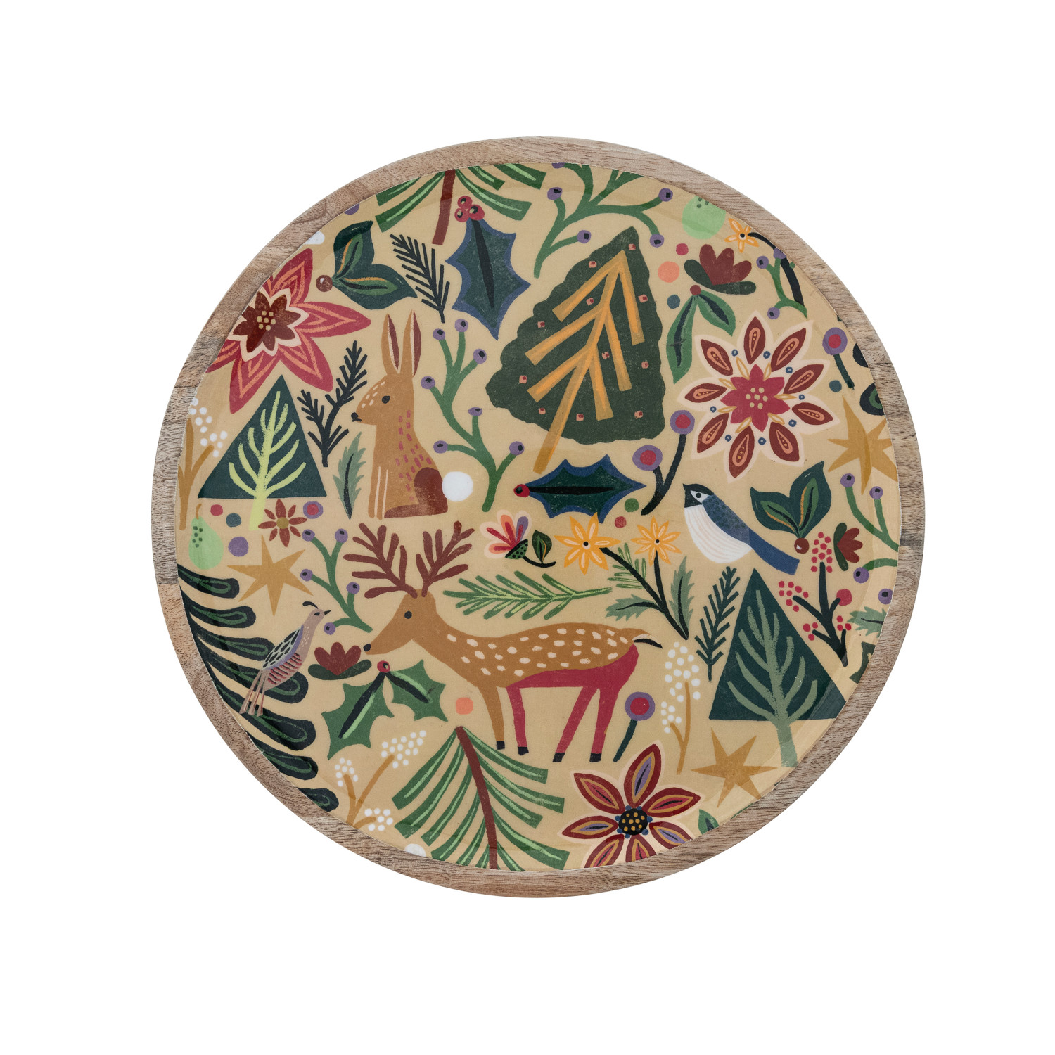 Catalog Name: 11-3/4" Round Enameled Mango Wood Tray w/ Animals & Seasonal Botanicals, Multi Color ©