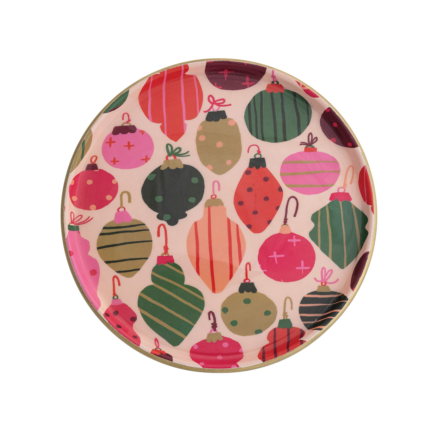 Catalog Name: 11" Round x 3-1/2"H Enameled Metal Pedestal w/ Ornaments Pattern, Multi Color & Gold Finish ©