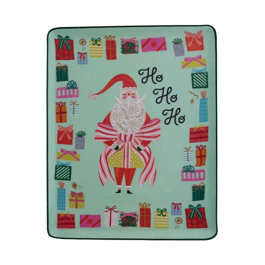 Catalog Name: 17-1/2"L x 14"W Enameled Metal Tray w/ Santa, Gift Box Border & Colored Edge "Ho Ho Ho", Multi Color ©
