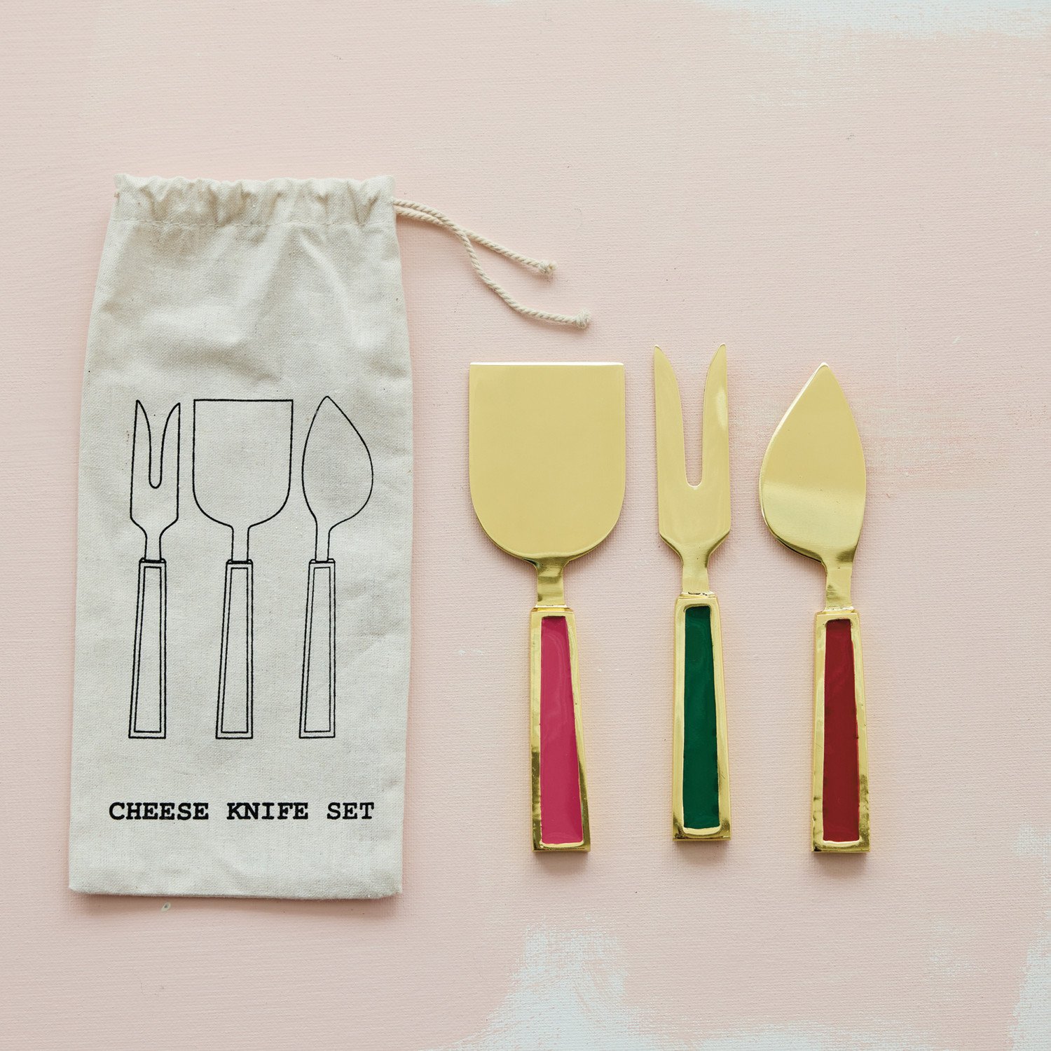 Stainless Steel Cheese Knives with Enameled Handles, Set of 3 in Printed Drawstring Bag