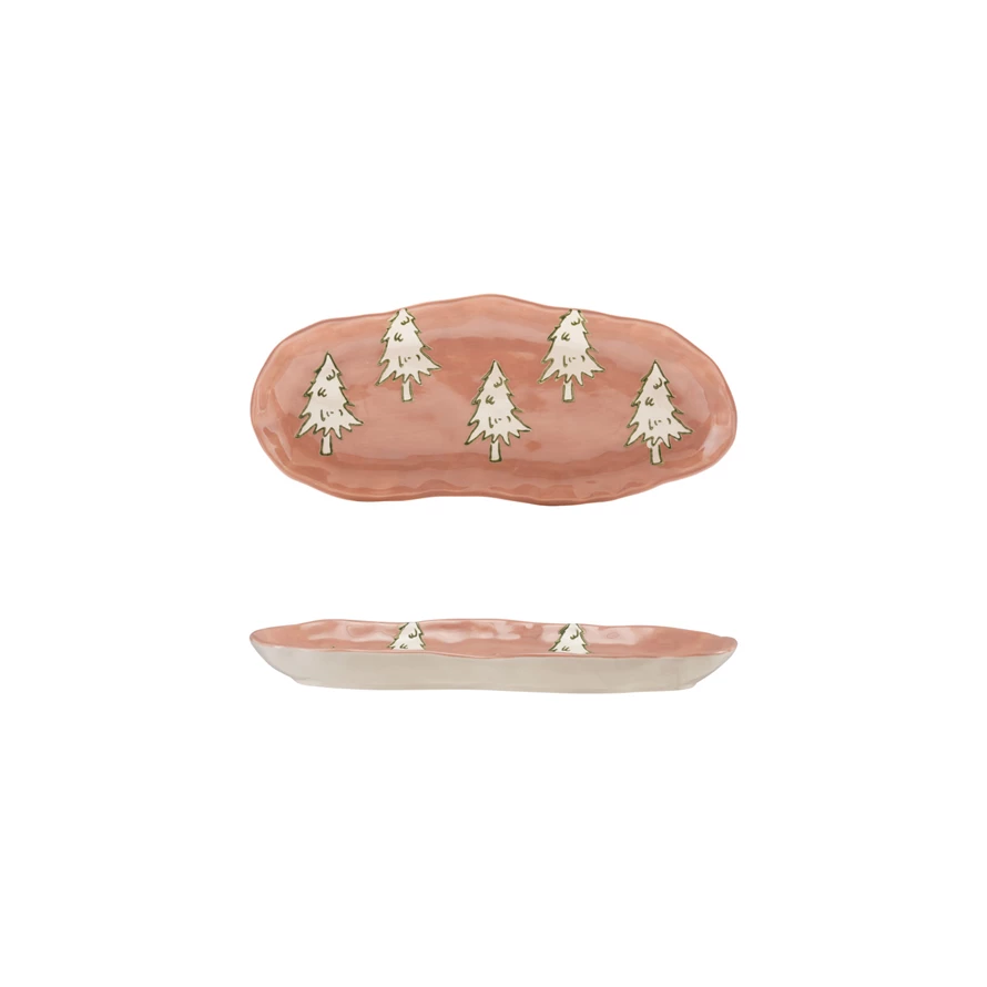 Catalog Name: 12"L x 5"W Oval Stoneware Organic Shaped Platter w/ Wax Relief Trees, Pink, White & Green