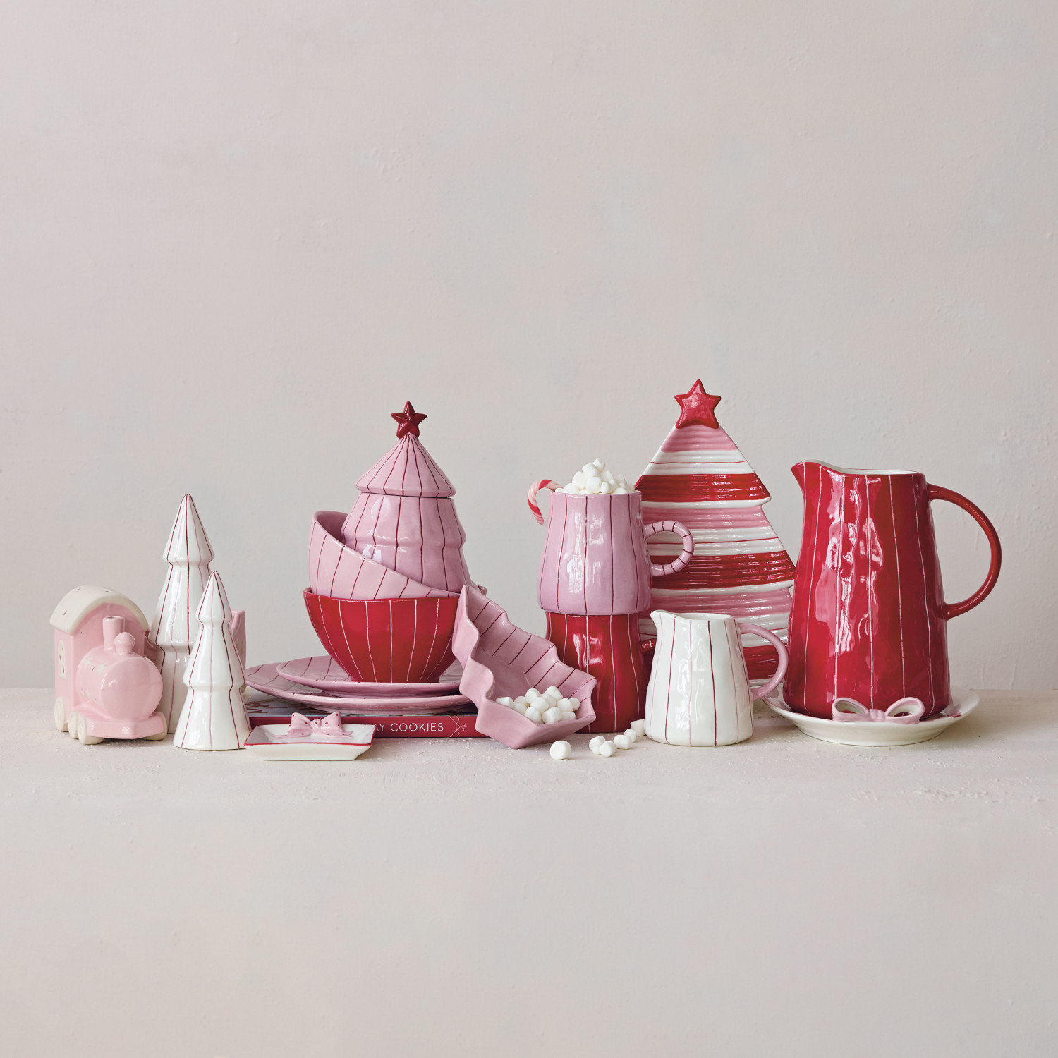 Catalog Name: 7"L x 5-1/2"W x 8-1/4"H 2 Quart Hand-Painted Stoneware Striped Organic Shaped Pitcher, Red & White