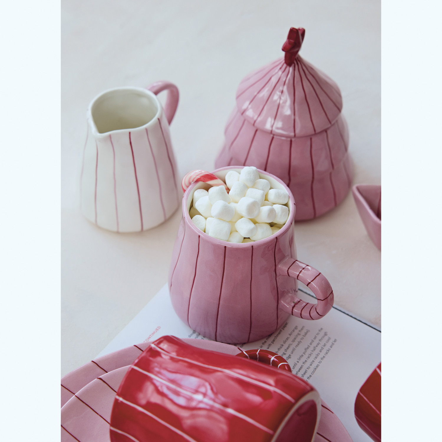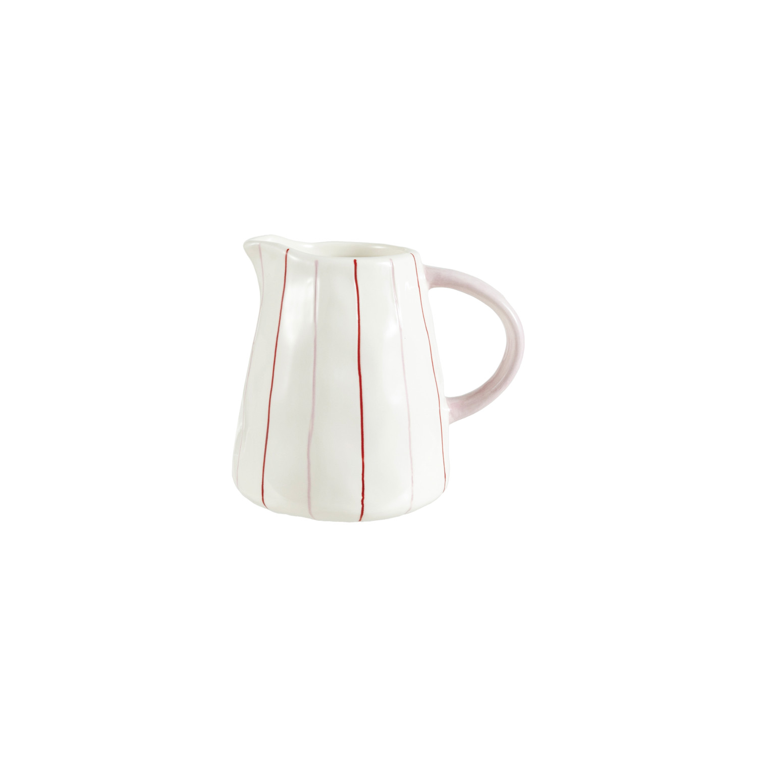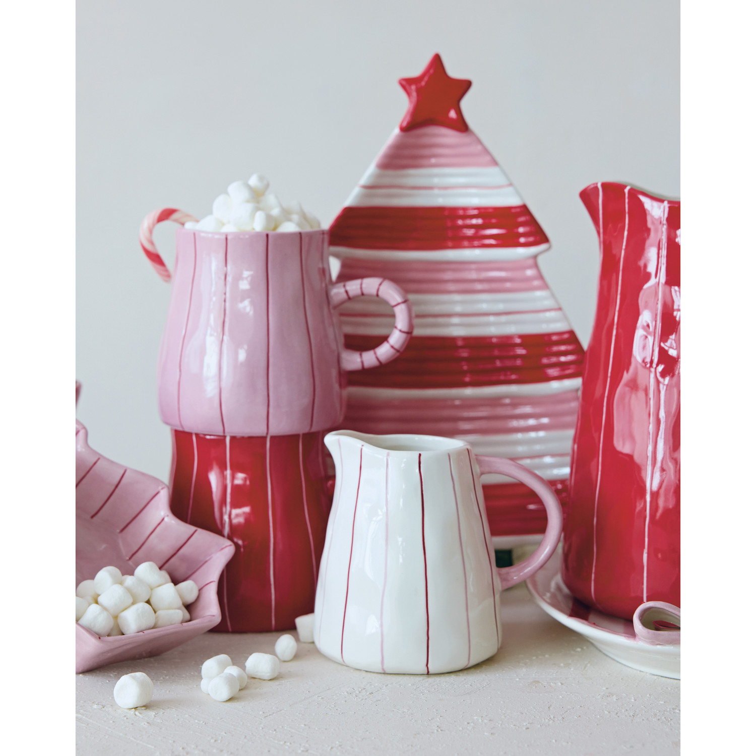 Catalog Name: 4-1/2"L x 3-1/2"W x 4"H 12 oz. Hand-Painted Stoneware Striped Organic Shaped Creamer, White, Pink & Red