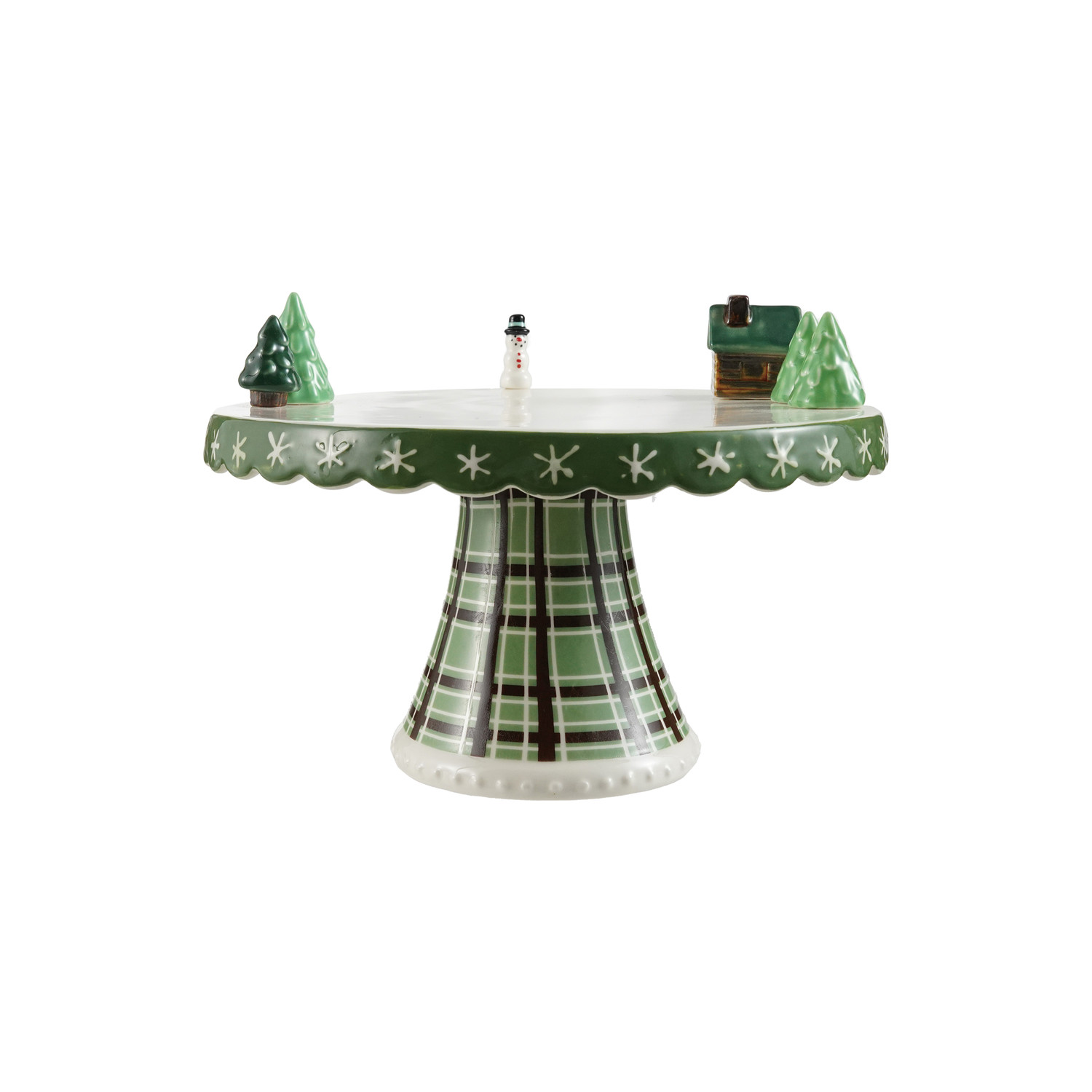 Hand-Painted Stoneware Scalloped Pedestal with Plaid Pattern, 3D Trees, House & Snowman ©