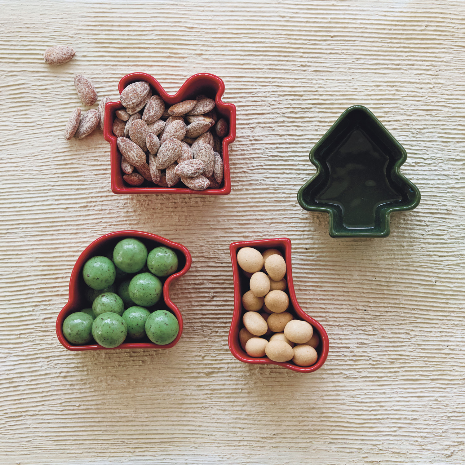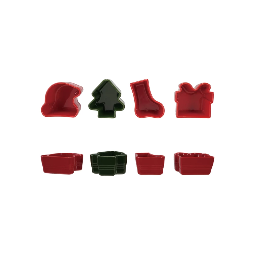 Catalog Name: 3-1/2"L x 3"W Stoneware Holiday Icon Shaped Dish, Red & Green, 4 Styles