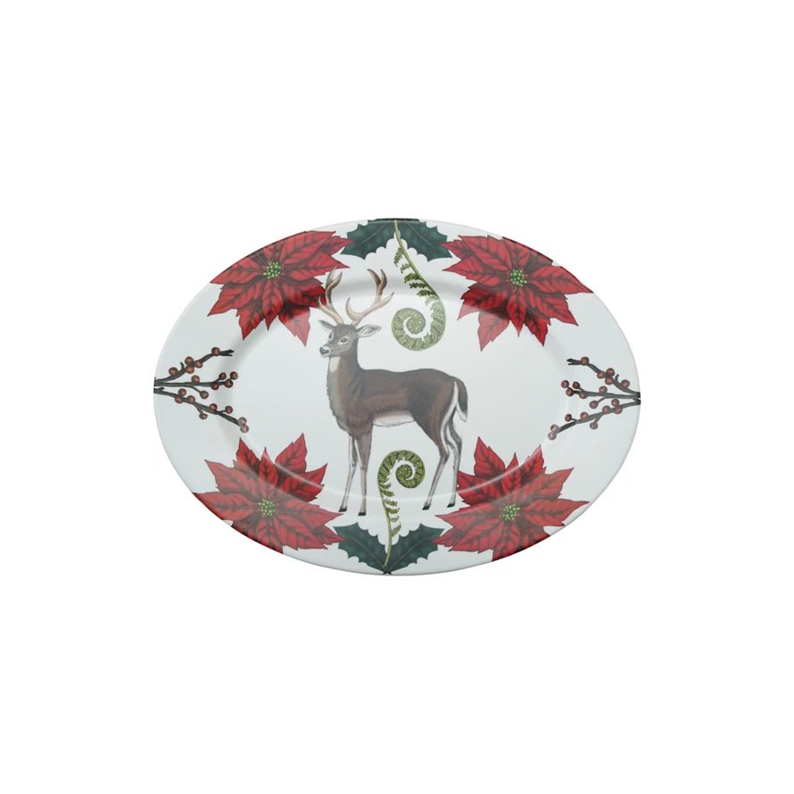 Catalog Name: 17"L x 12-1/2"W Oval Melamine Platter w/ Seasonal Botanicals & Deer, Matte Finish, Multi Color ©