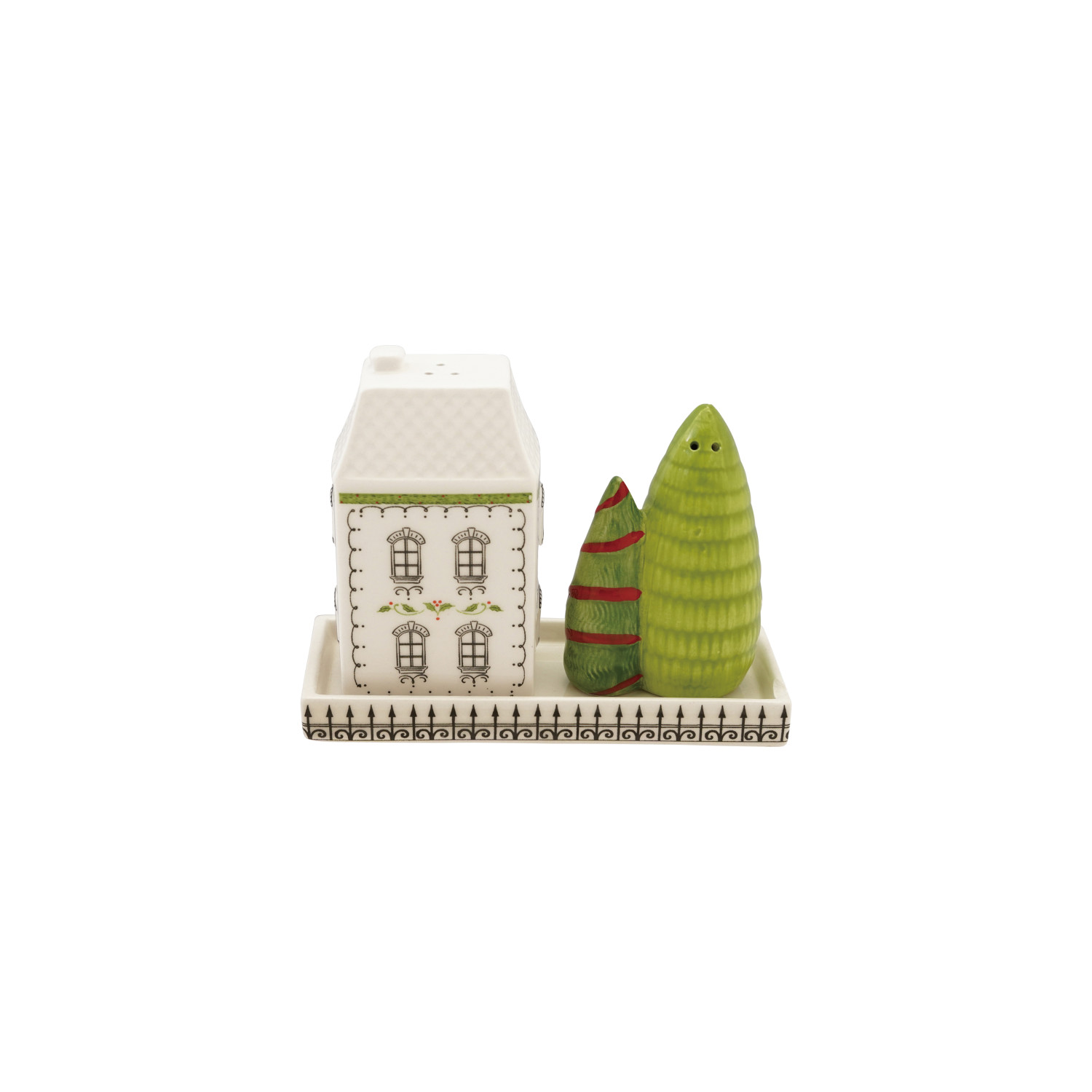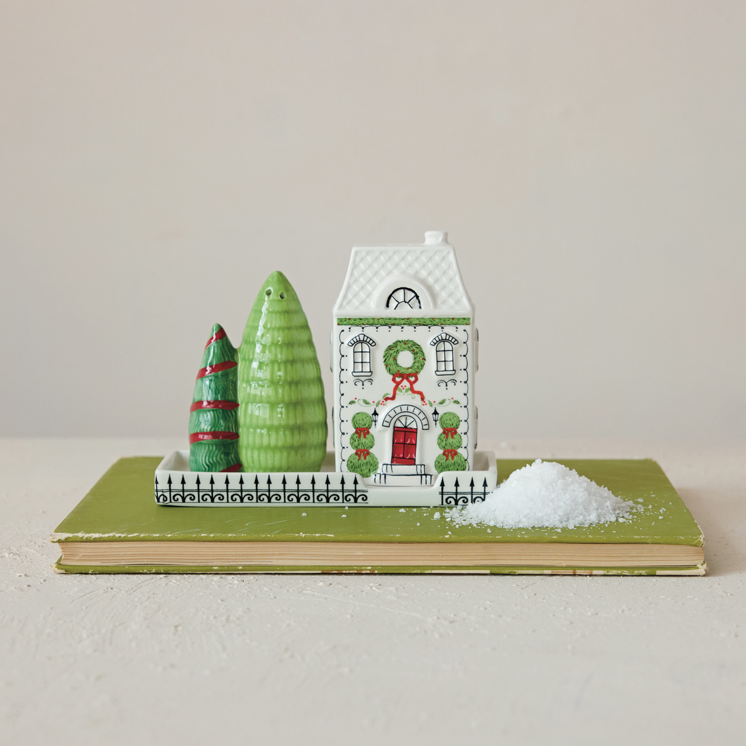 Ceramic House & Trees Shaped Salt & Pepper Shakers with Tray, Set of 3