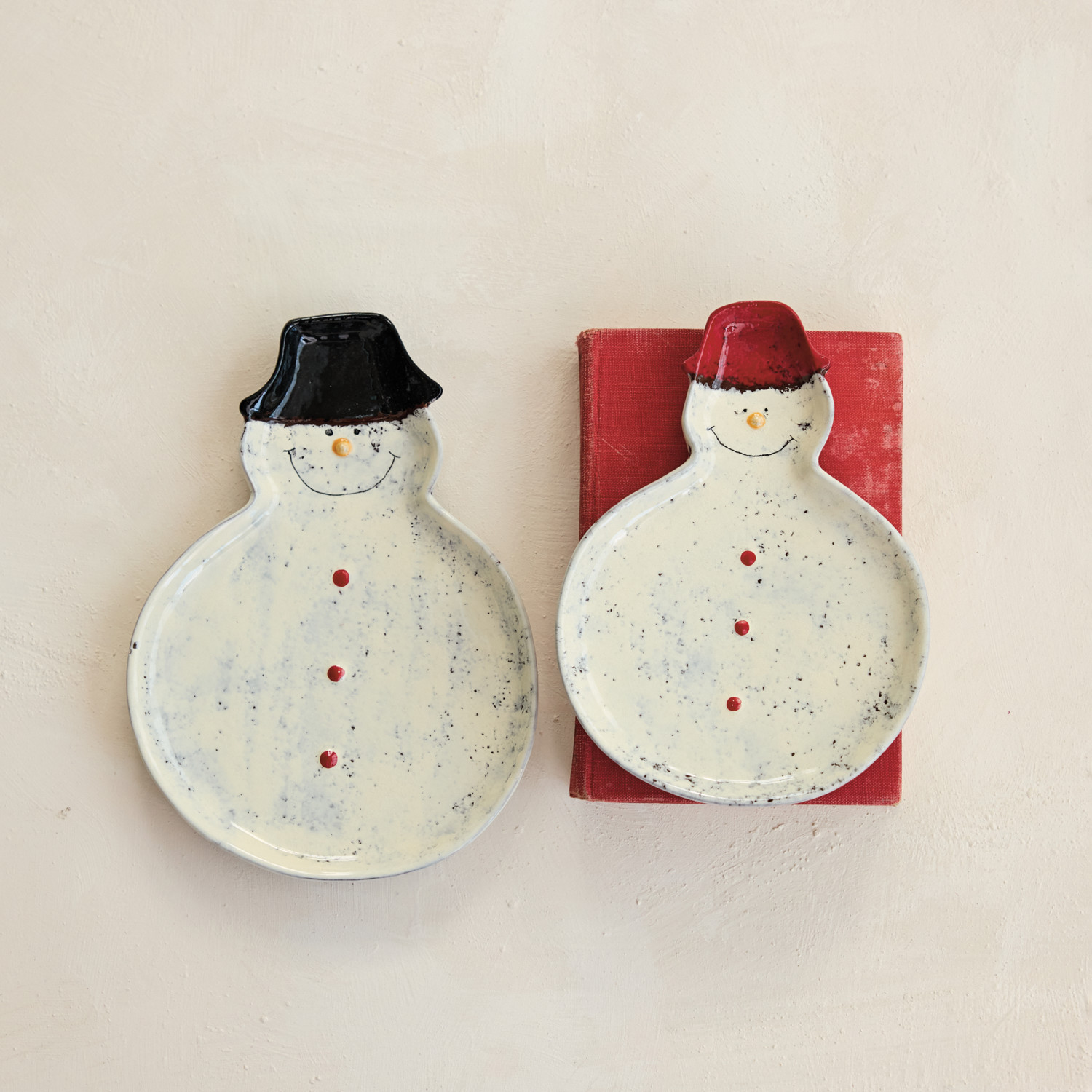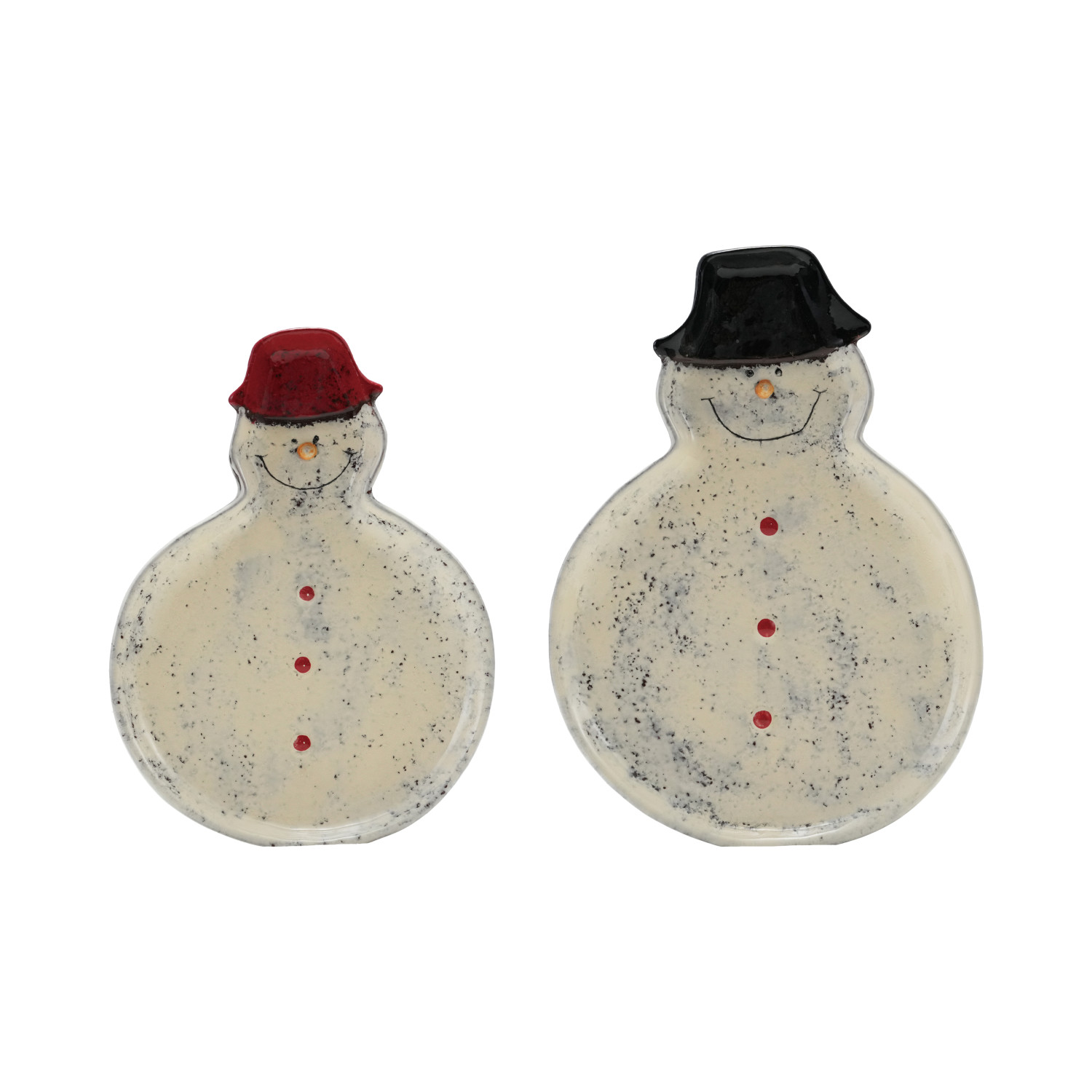 Catalog Name: 9"L x 6-1/2"W & 8"L x 6"W Hand-Painted Ceramic Snowman Shaped Plates, Reactive Glaze, White, Red & Black, Set of 2 (Each One Will Vary)